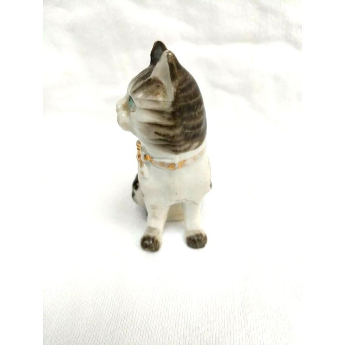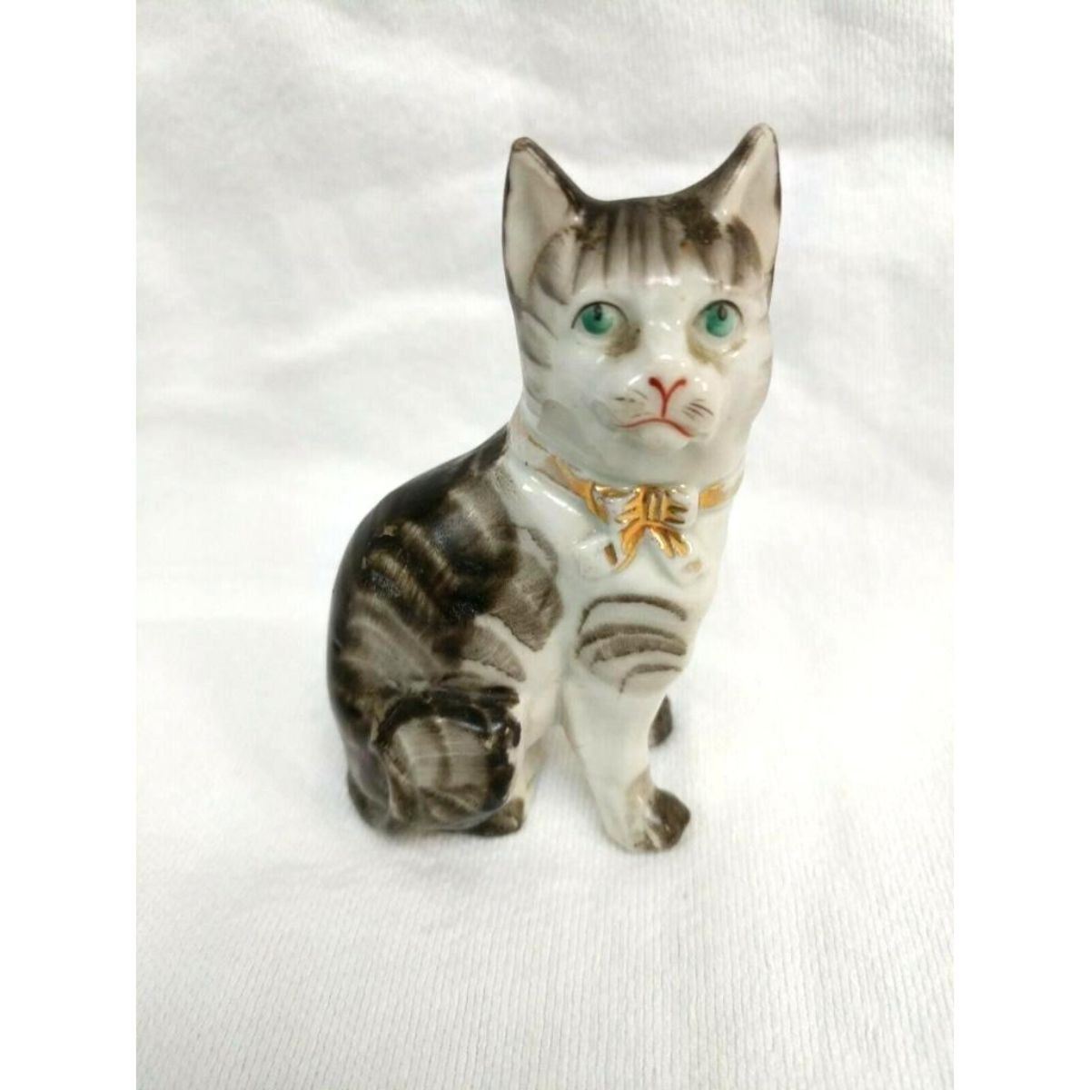 Superb 19thc Staffordshire figure of a grey tabby cat in sitting pose, c.1870's. No chips, cracks, or repairs, this fantastic antique hand painted figure stands about 3 1/2" tall. Separately molded legs, outstanding bright green eyes,
