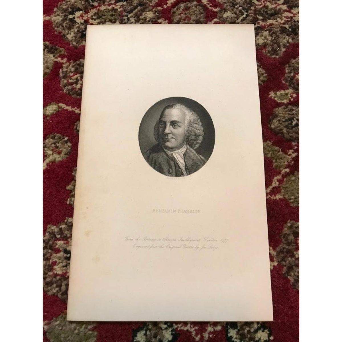 1879 steel engraving bookplate of founding father Benjamin Franklin, from the portrait in the Almon's Intelligencer, London 1777, engraved from the original picture by Jno. Lodge. 5 1/2" X 9 1/2"  ( January 6, 1705 – April 17, 1790 ) was an American polymath & one of the Founding Fathers of the United States. Franklin was a leading author, printer, political theorist, politician, Freemason, postmaster, scientist, inventor, humorist, civic activist, statesman & diplomat.
