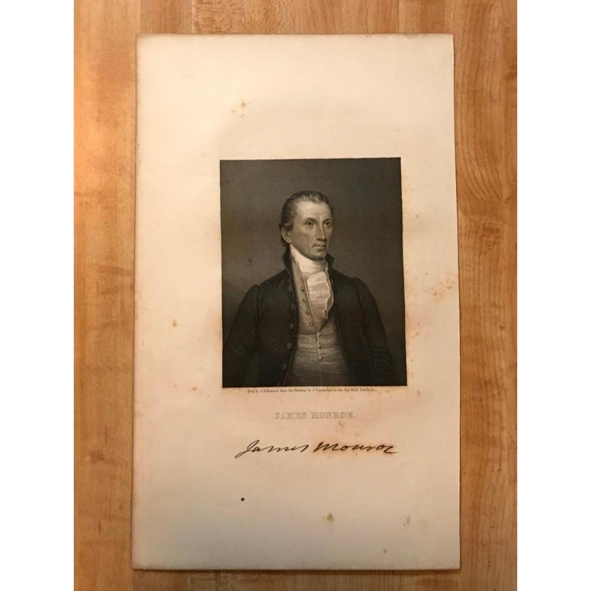 c.1859 steel engraving of the 5th President of The United States, James Monroe. Engraved by A. B Durand, from a painting by J. Vanderlyn in the City Hall of New York. 6 1/4" X 10 1/2" Bookplate print with minor scattered foxing.Â