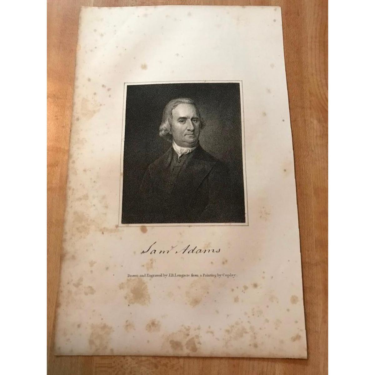 1846 steel engraving of Samuel Adams, drawn & engraved by J. B. Longacre from a painting by Copley. 5 3/4" X 9 3/8". *  bookplate engraving with scattered foxing. Samuel Adams ( 1722 – 1803) was an American statesman, political philosopher,  2nd signer of The Declaration of Independance & one of the Founding Fathers of the United States. He was a politician in colonial Massachusetts, a leader of the movement that became the American Revolution, & one of the architects of the principles of American republicanism that shaped the political culture of the United States. He was a second cousin to his fellow Founding Father, President John Adams.