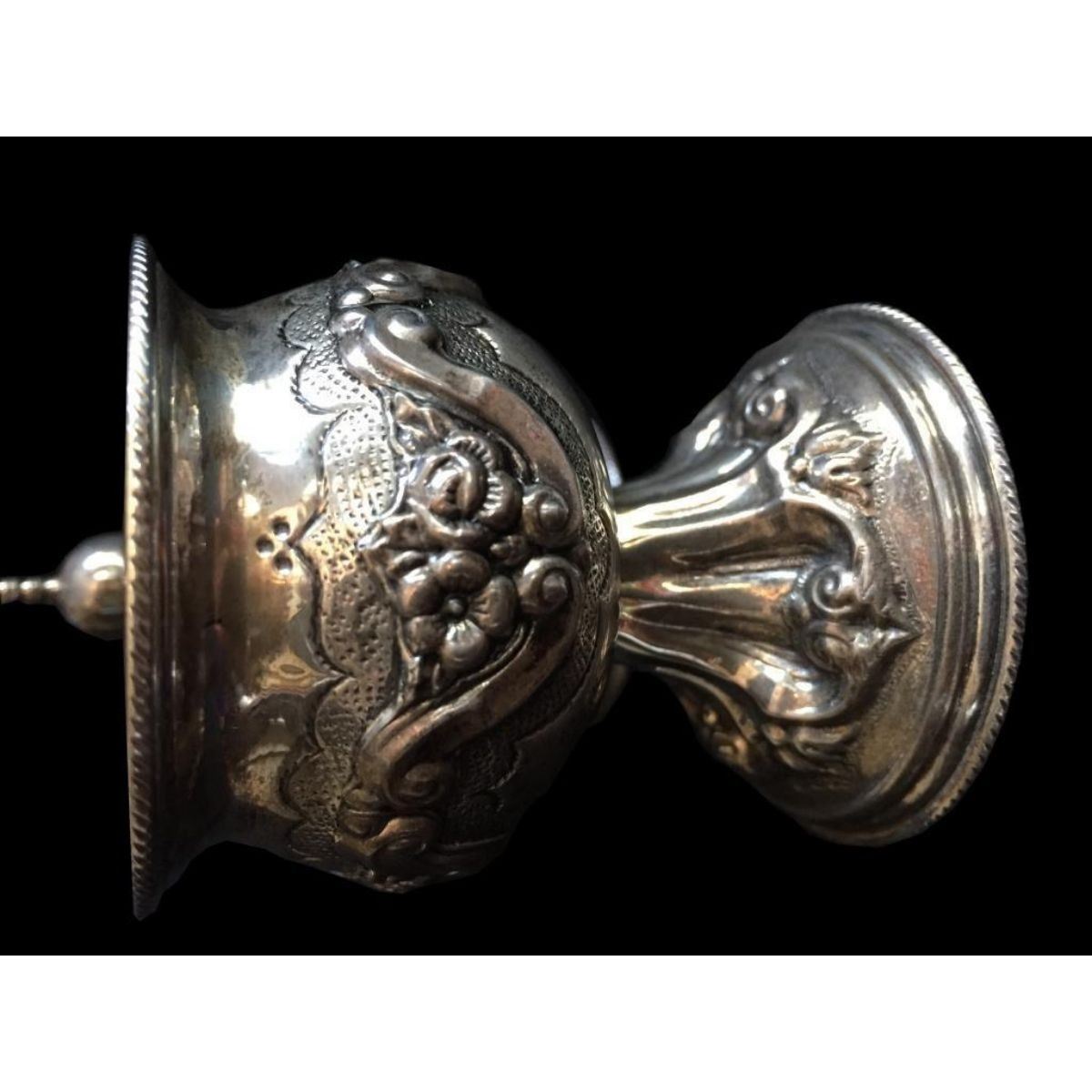 19th-century sterling silver, double pedestal, open salt cellar with ornate embossed roses & swags, ball & bead handle. Stamped " STERLING" underneath the bridge of the handle. 5" L X 2 1/4" W X 7 1/4" H.