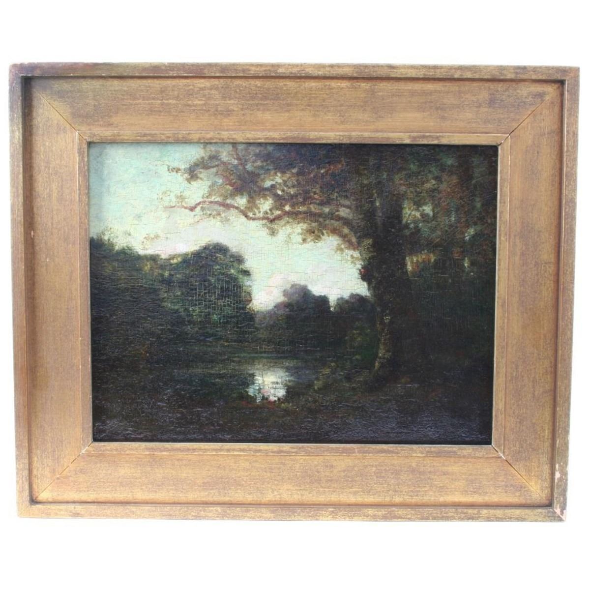 Style of Camille Corot, oil on board landscape painting depicting a tree beside a lake, by Julia Pairpoint Brainard Palmer, in an early 20th century arts & crafts 12" X 16" gold wood frame. * on the reverse - a