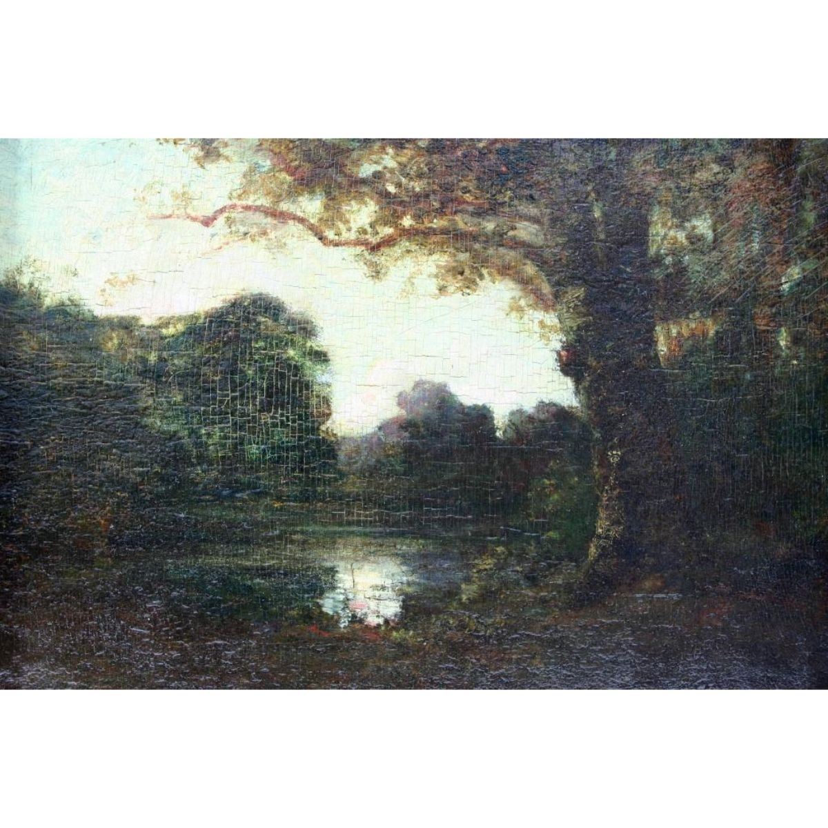 Style of Camille Corot, oil on board landscape painting depicting a tree beside a lake, by Julia Pairpoint Brainard Palmer, in the early 20th century. Arts & Crafts 12" X 16" gold wood frame.Â