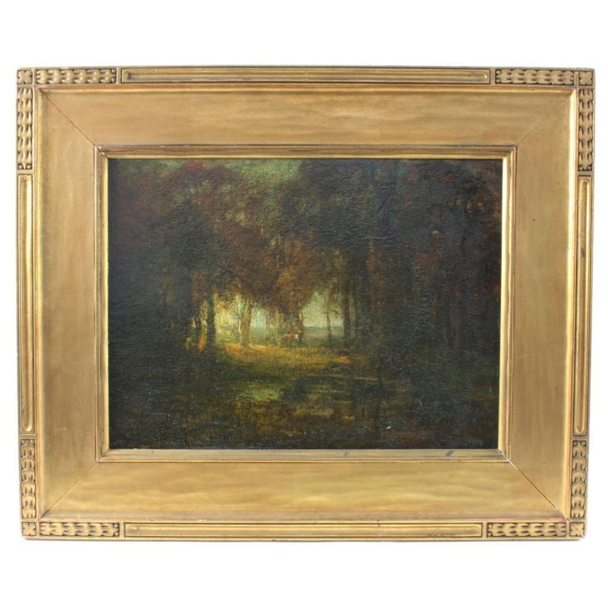 Landscape, oil on board, by Julia Pairpoint Brainard Palmer. 12" X 16" depicts daylight showing through the opening in a forest. Framed in an early 20th century, Arts & Crafts Gold Newcomb-Macklin Frame. Newcomb Macklin Picture Framers Sticker attached to reverse side.