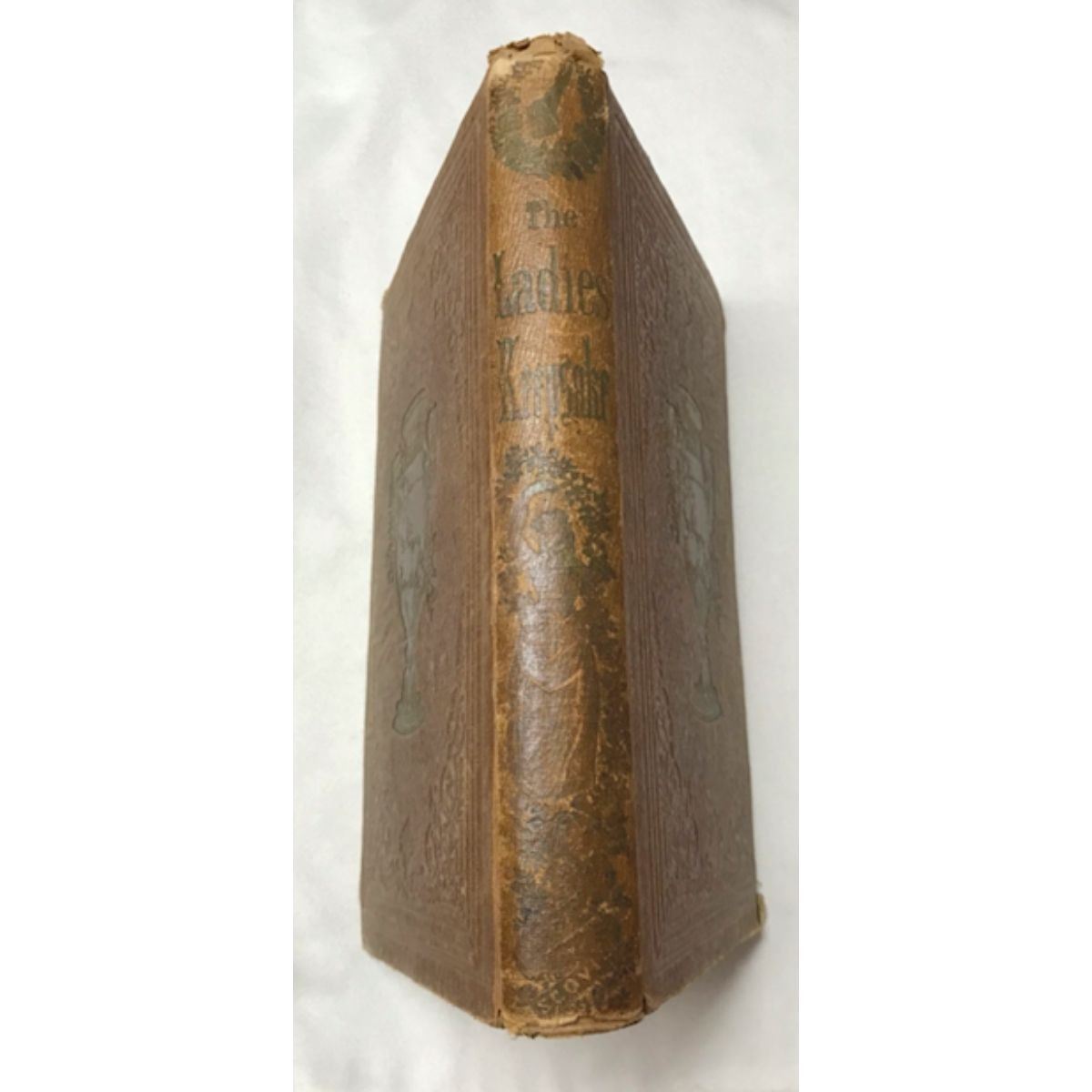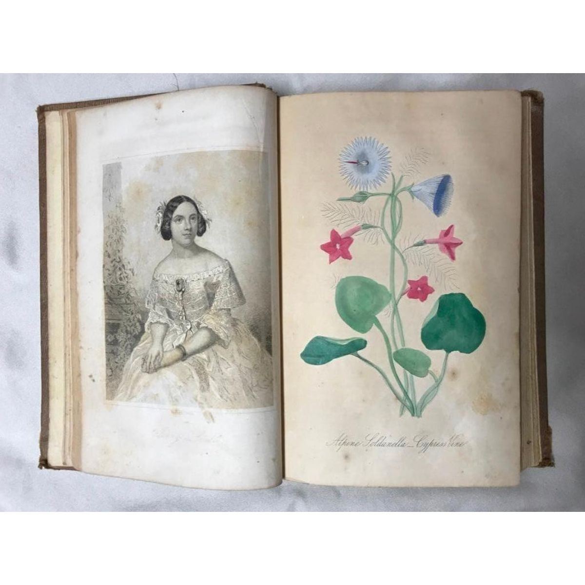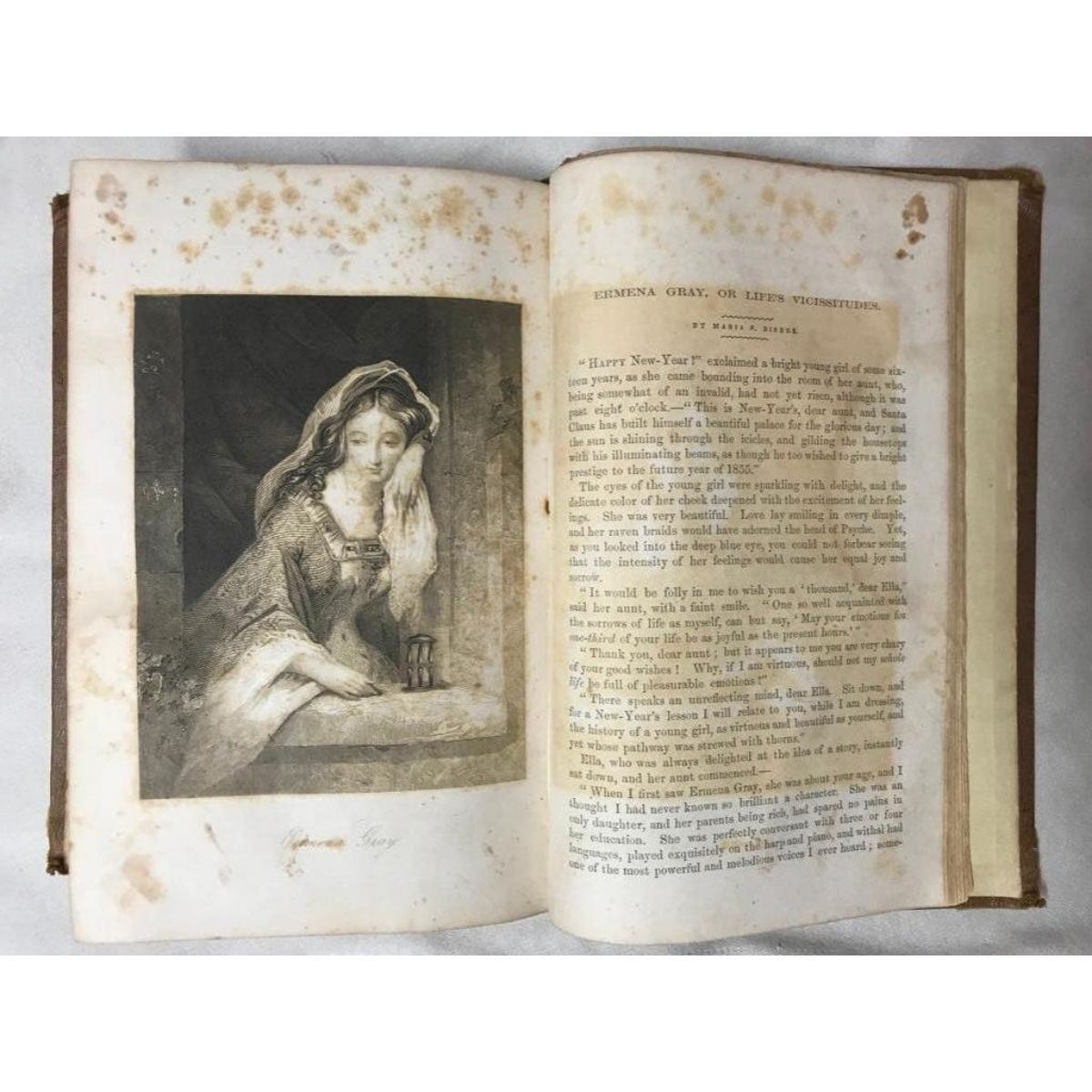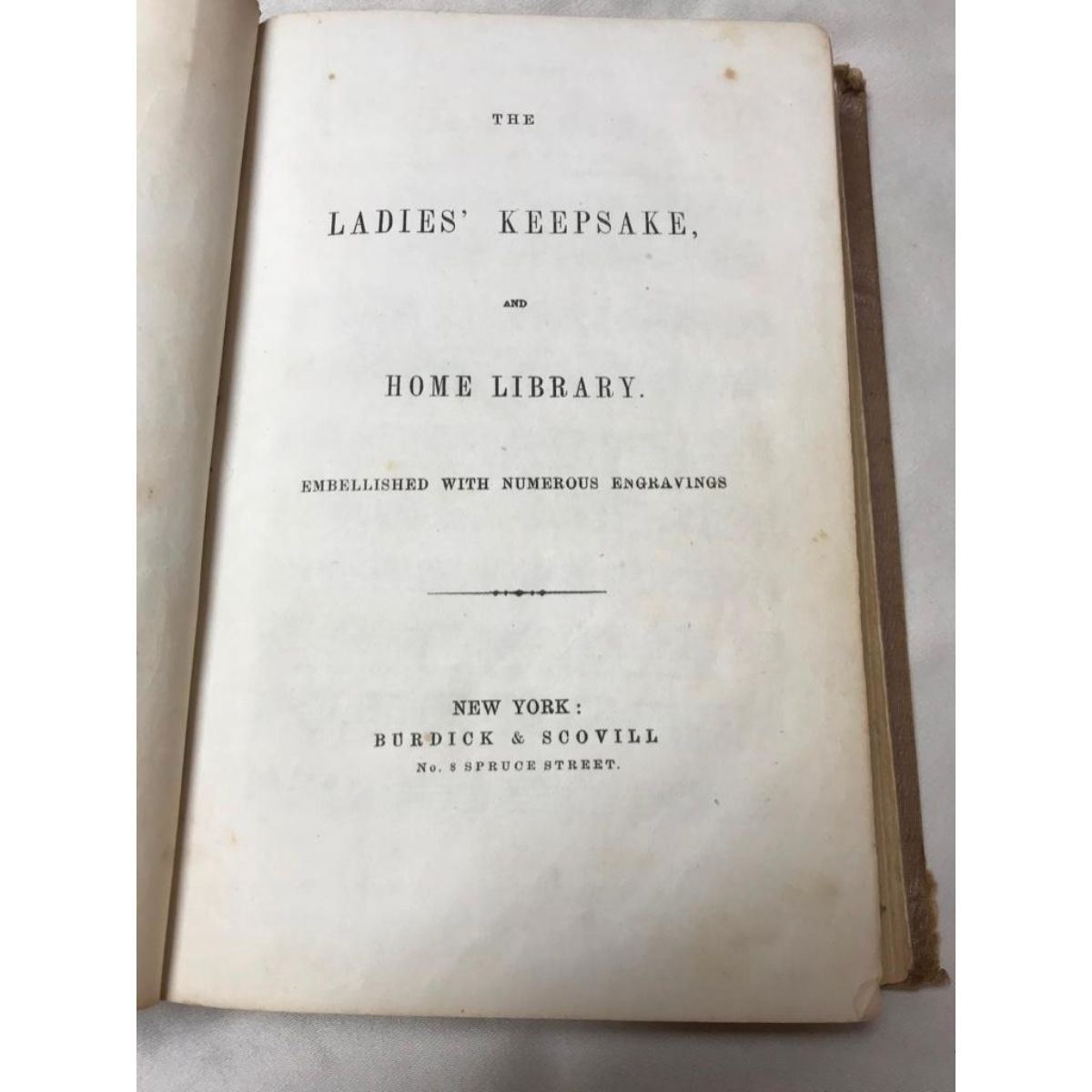 19th Century "The Ladies' Keepsake, And Home Library" Illustrated book with brown embossed leather cover with gilt decorations, front & back. No publication date listed, but appears to be mid 1800's. Contains 12 beautiful steel engravings & 4 engravings of flowers that are hand painted. Also sheet music pieces, poetry & many stories for ladies of the day. There is significant foxing and browning in various areas throughout the book, but very readable and no tears or damage other than that. Only marking is the owners inscription, "Nellie Rowell".