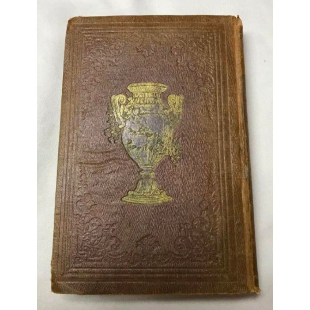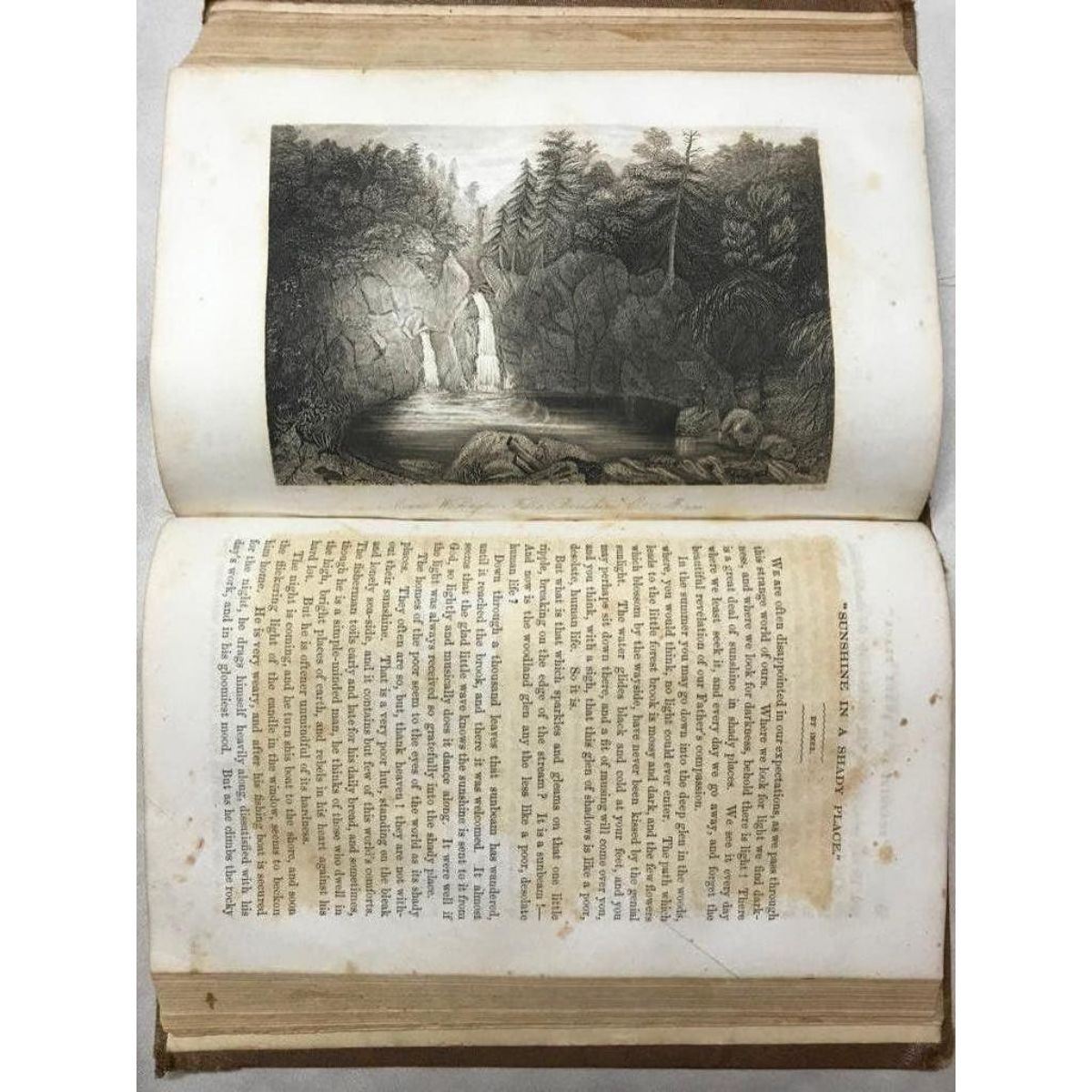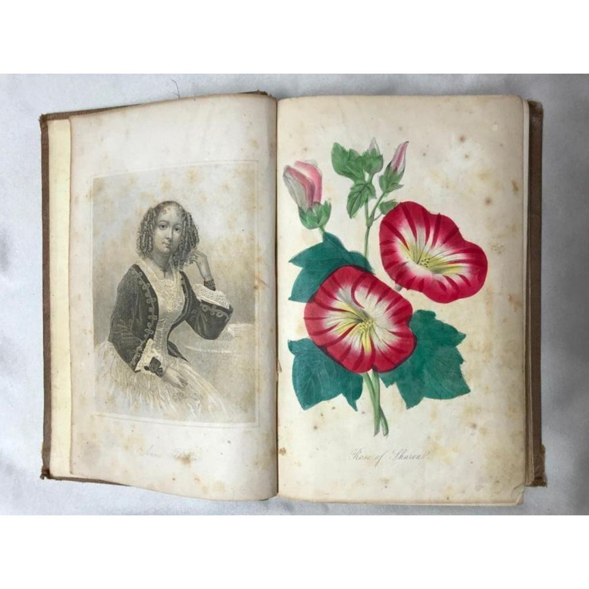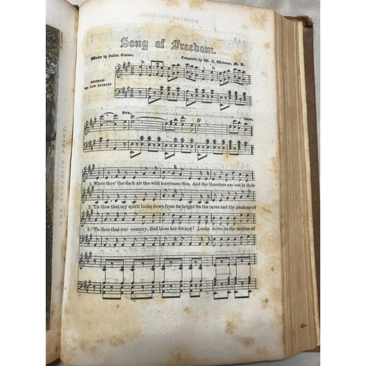 19th Century "The Ladies' Keepsake, And Home Library" Illustrated book with brown embossed leather cover with gilt decorations, front & back. No publication date listed, but appears to be mid 1800's. Contains 12 beautiful steel engravings & 4 engravings of flowers that are hand painted. Also sheet music pieces, poetry & many stories for ladies of the day. There is significant foxing and browning in various areas throughout the book, but very readable and no tears or damage other than that. Only marking is the owners inscription, "Nellie Rowell".