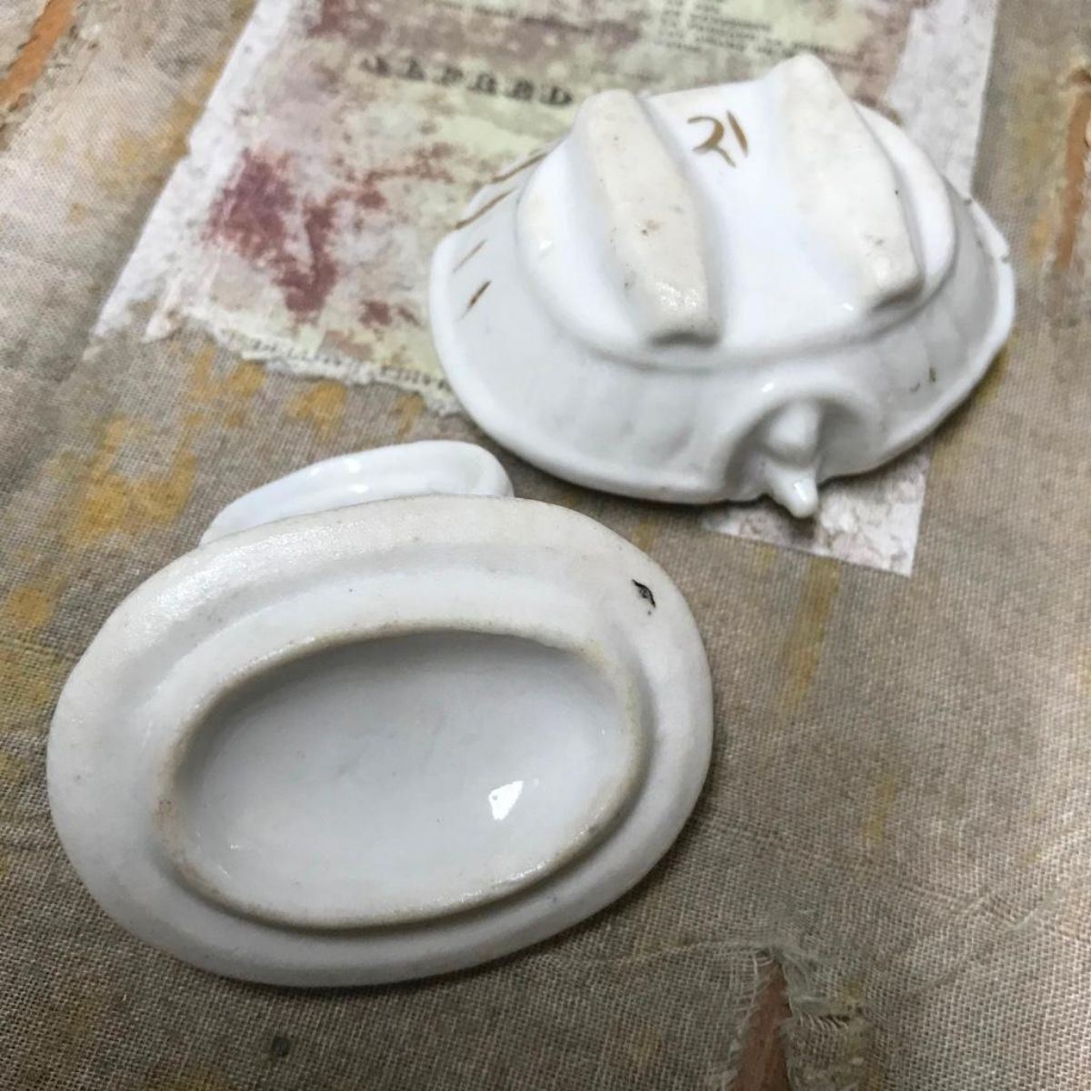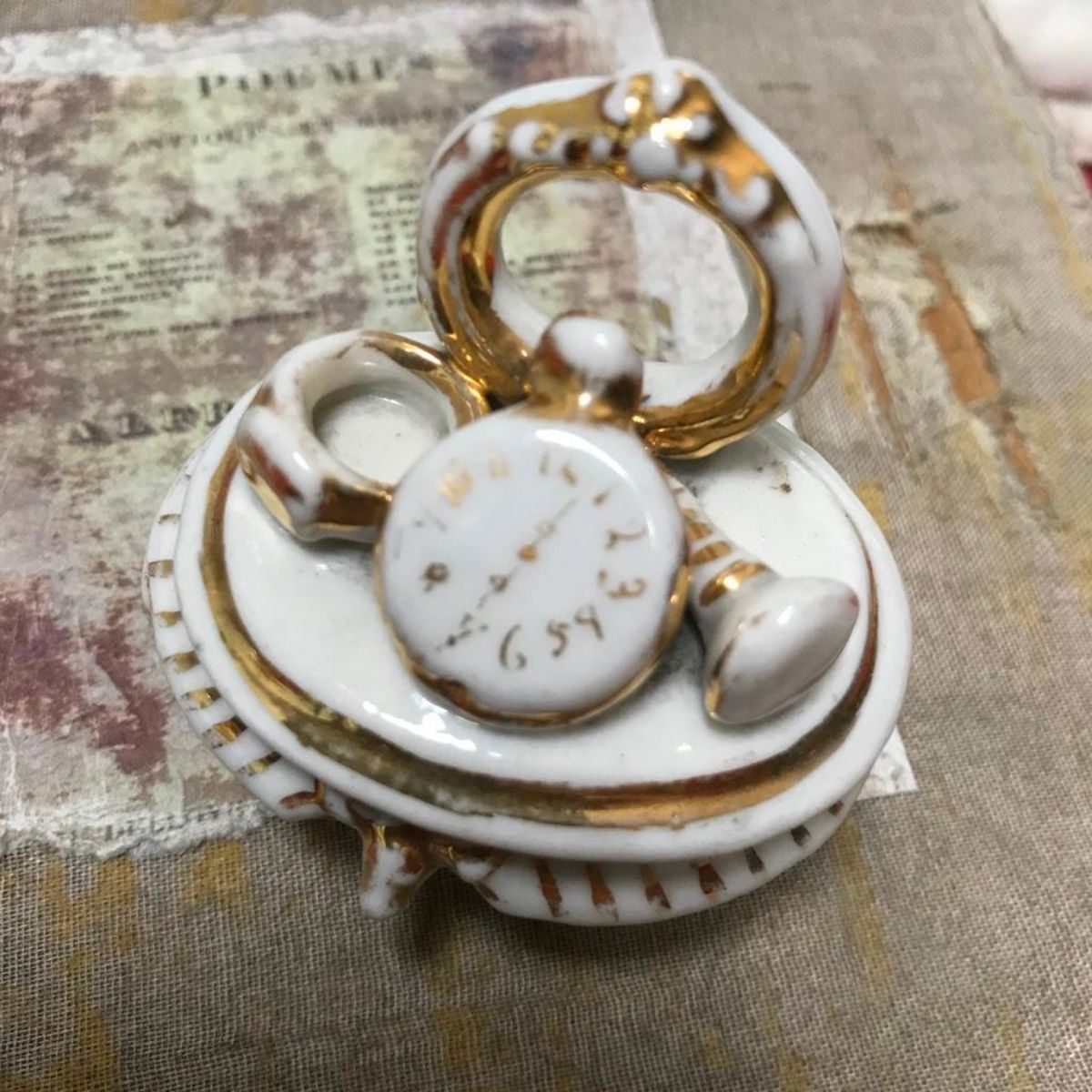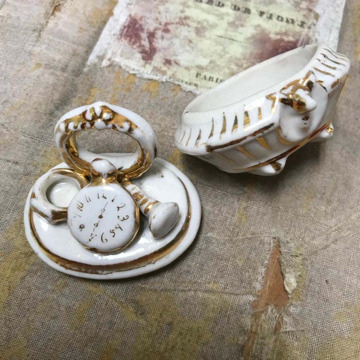 Late 19th Century Victorian German Conta Bohme porcelain fairing box, for storing trinkets or jewels, in the form of a tiny dresser, topped with a pocket watch & jewelry. * in good condition for age, with much of the original gilt remaining. Called "fairing boxes" because they were made to be sold or given away as prizes at fairs & carnivals during the mid 19th century. Â