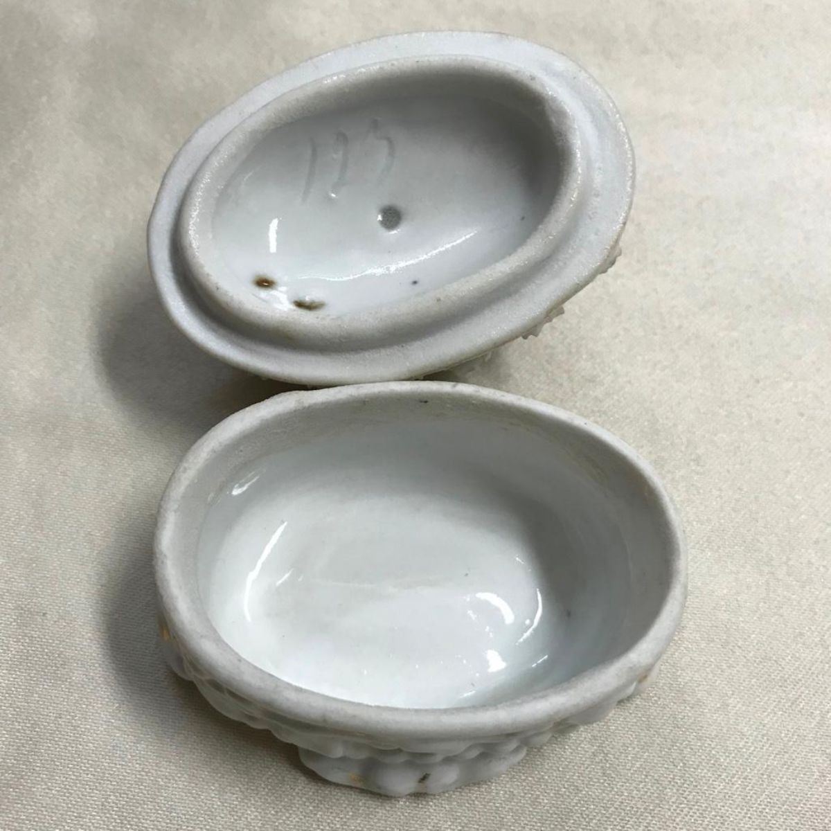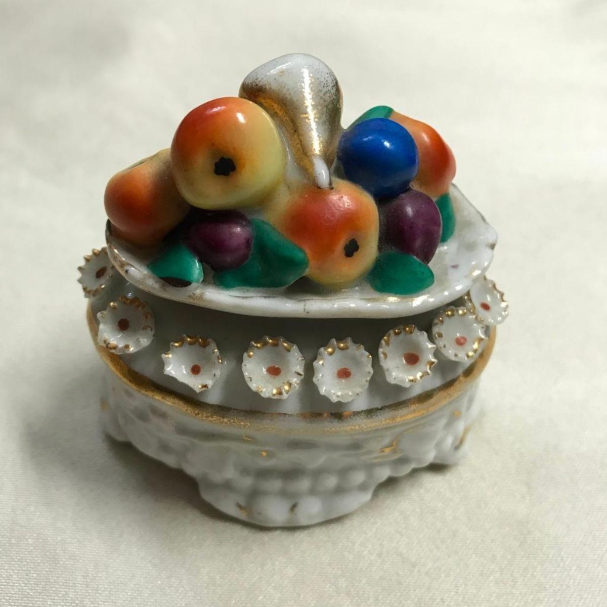 19th Century English Victorian Staffordshire fairing box, trinket jewel box. Porcelain with gilt trinket box in the form of abowl of colorful fruit.