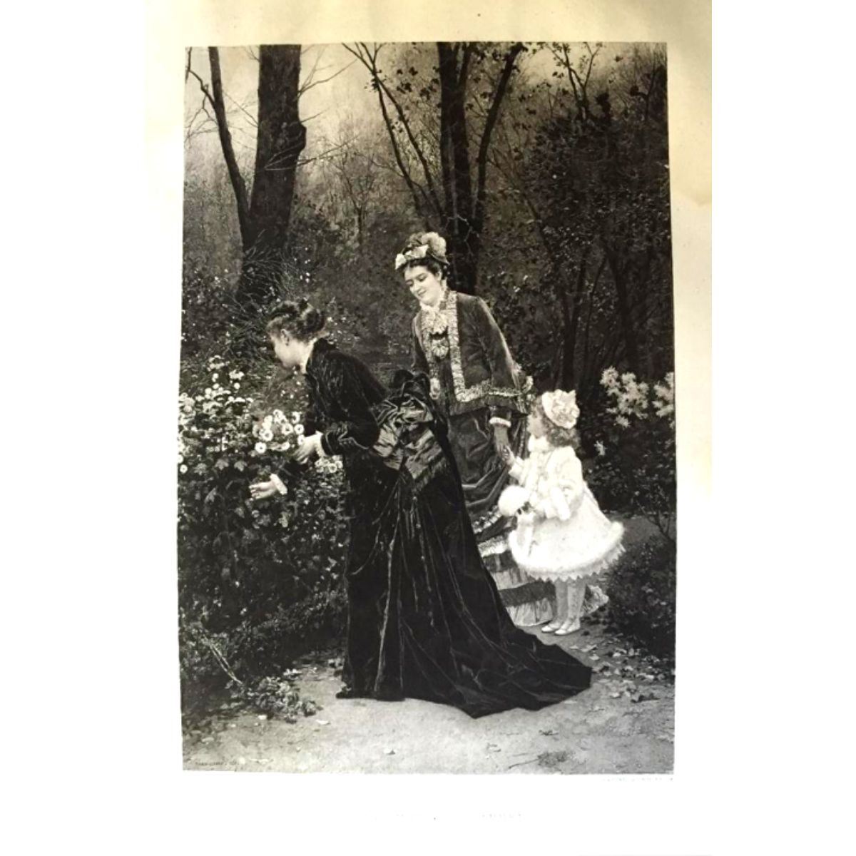 Original 1883 photogravure print, from an original 1874 painting entitled, " The God-Mother's Garden" by Firman Girad. The scene depicts two well-dressed ladies, one holding the hand of a well dressed little girl. Goupil & Cie engravers, on Japon paper. 10" X 14". Comes with original descriptive divider page. * slight foxing overall & water staining to top margins.