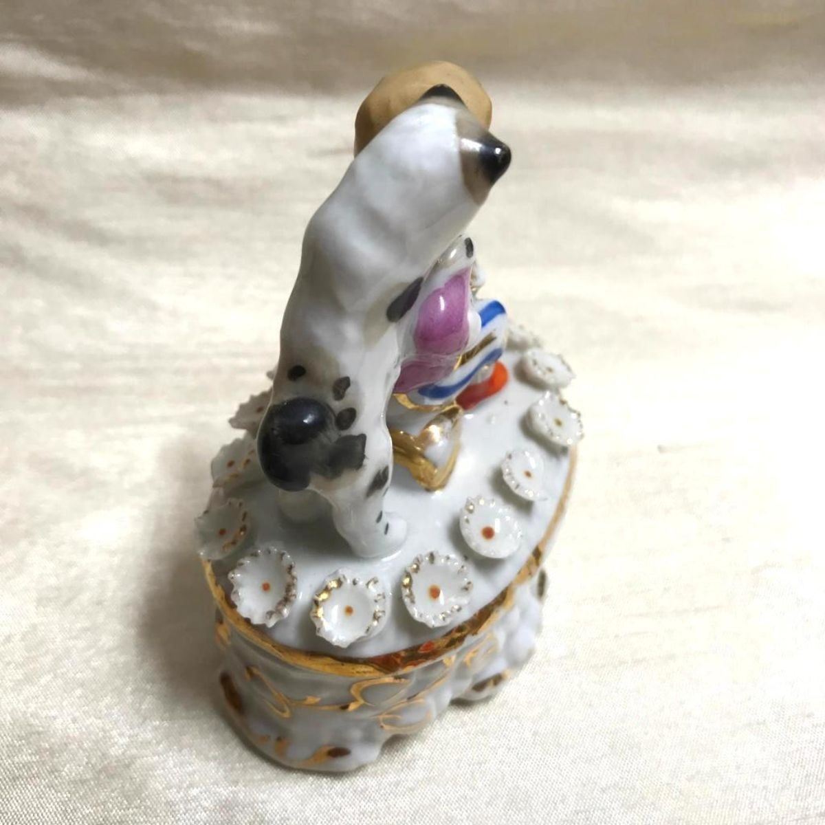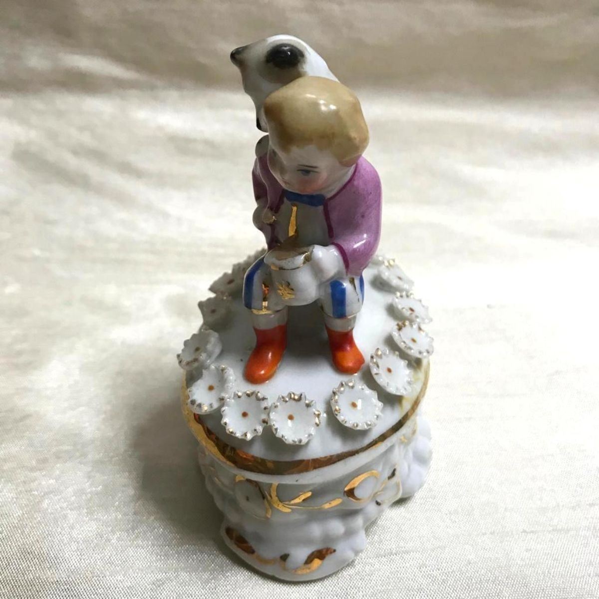 19th Century Victorian porcelainConta Boehme Fairing Box, Little Boy & Dog. 2 3/4" W X 2" L X 3 1/2" H. Conta Boehme stamp & numbers inside lid.* vibrant colors remain with most of the gilt intact.some losses to applied florals on lid.