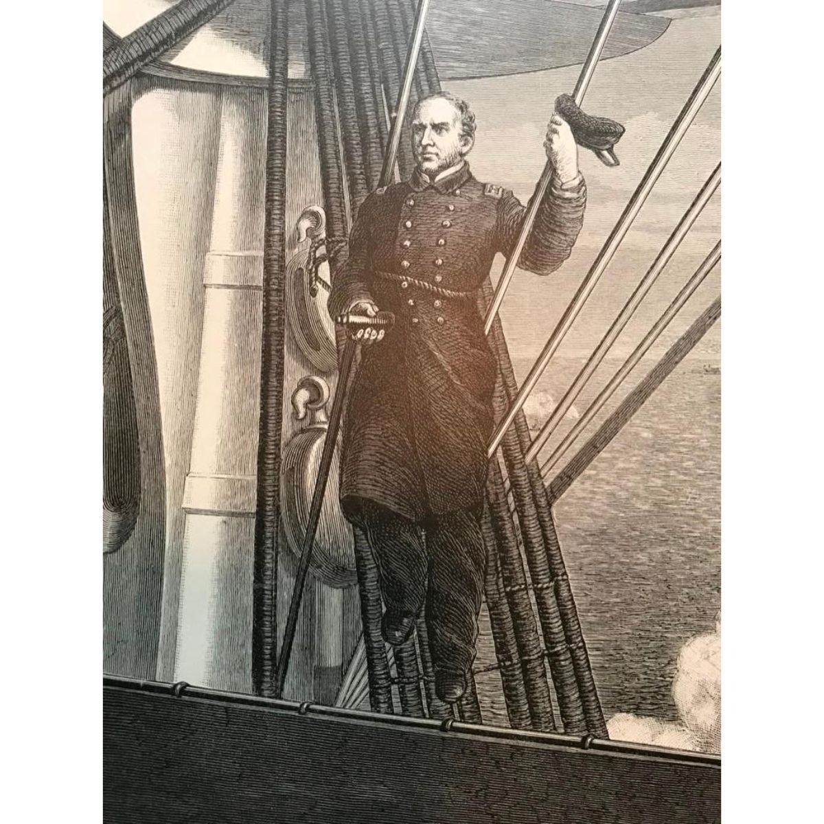 1879 wood cut engraving of Civil War Union Admiral Farragut titled, "Farragut In The Main-Rigging", shows the Admiral lashed to the ship's rigging with hat in hand, after a Harper's Weekly engraving from 1868. 6" X 10".