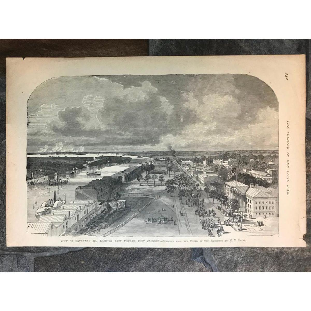 View of Savannah Georgia, Looking East Toward Fort Jackson - Sketched from the Tower of the Exchange. Book page print from The Soldier In Our Civil War. 10 1/2" X 16". * some cracking along the edges due to age.Â