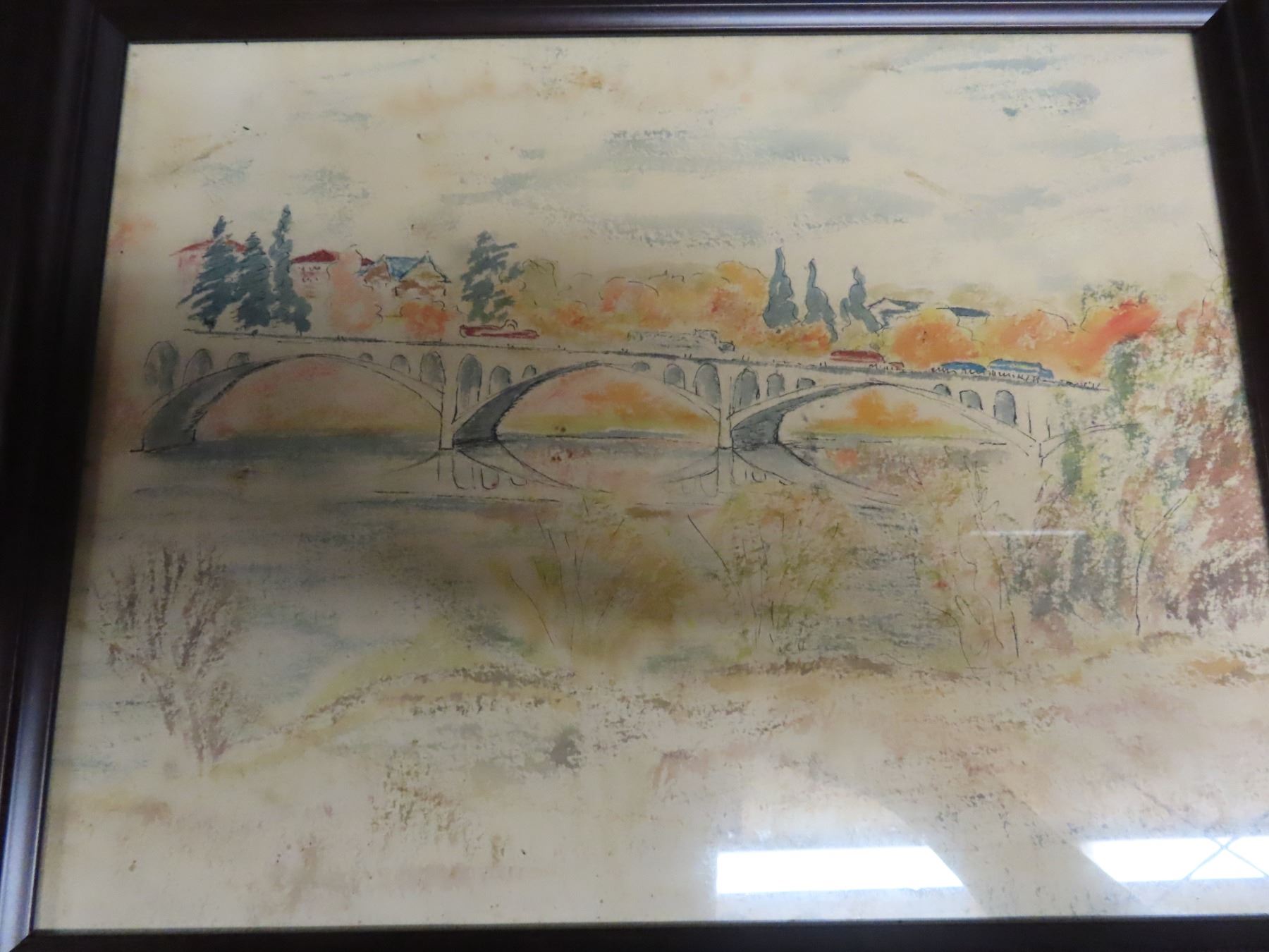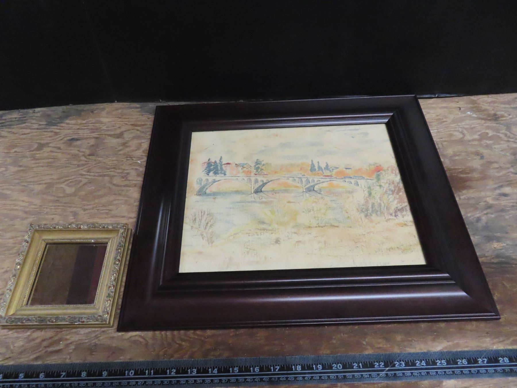 19x16" framed picture of bridge and 6x6" mirror