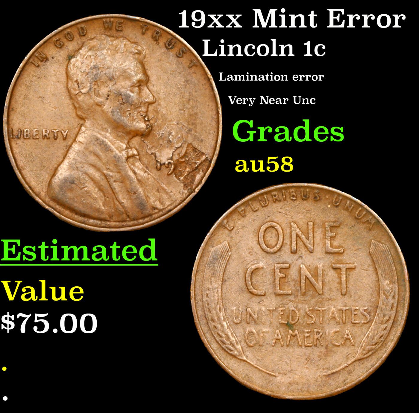 19xx Mint Error Lincoln Cent 1c Grades Choice AU/BU Slider.