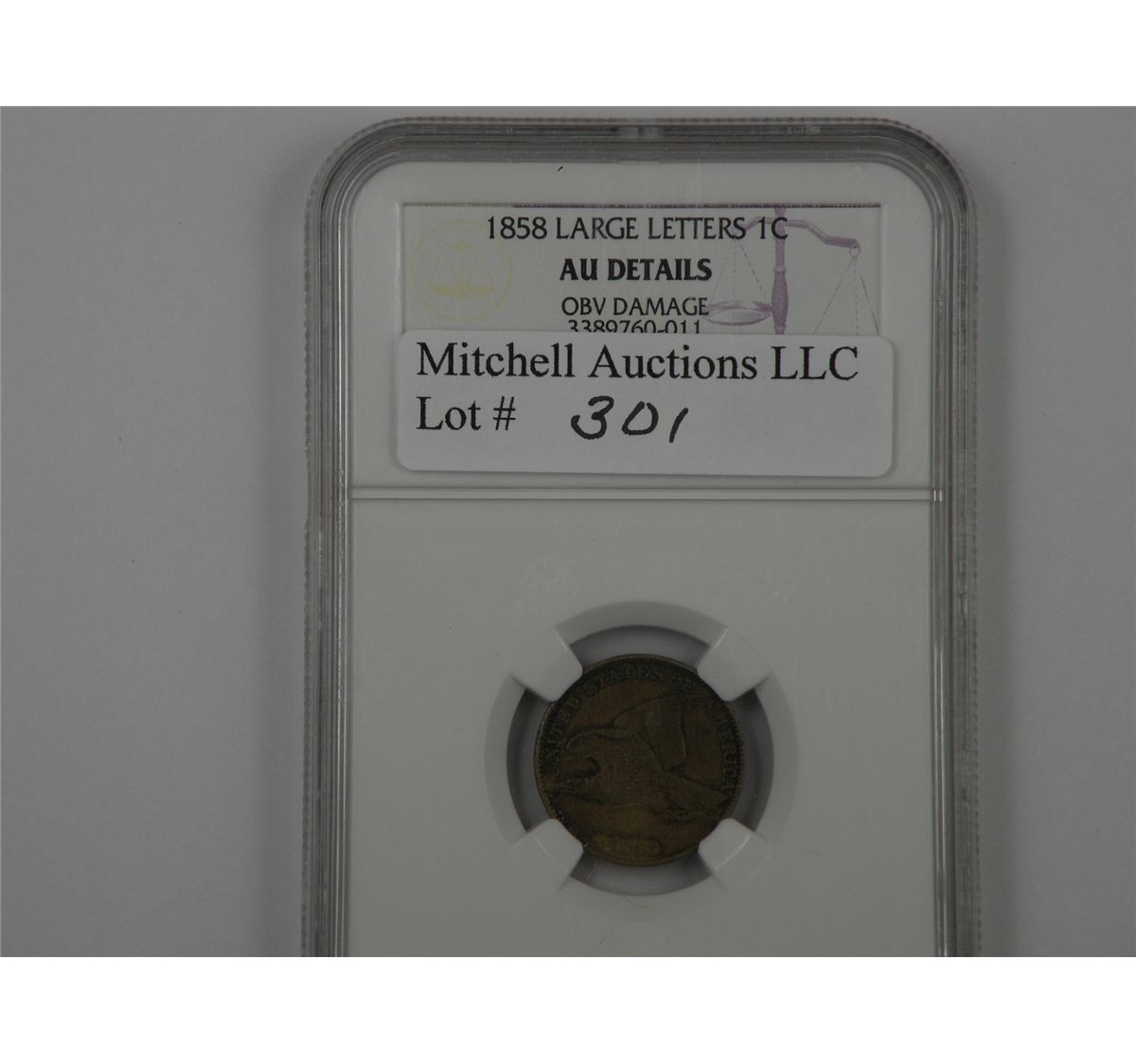 1C 1858 Large Letters, Flying Eagle. NGC AU Details, Obv damage. There is an old dig at the left obverse. Furthermore, the degree of detail in our opinion is no better than Ext. Fine. Est.$40
