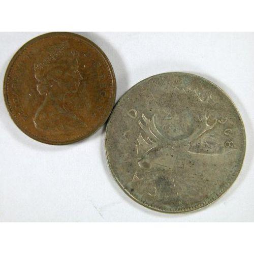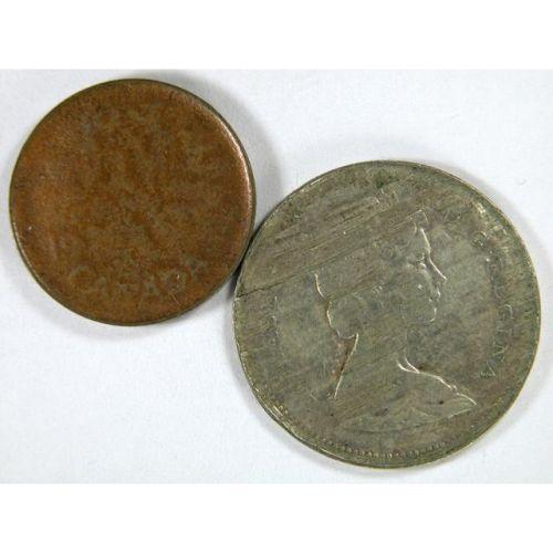 Canada One Cent Tiara Design Struck Through Capped Die, Brown Uncirculated. Plus Twenty-Five Cents 1968 Silver Struck on a Split Planchet, 3.1 grams, EF. Total two pieces