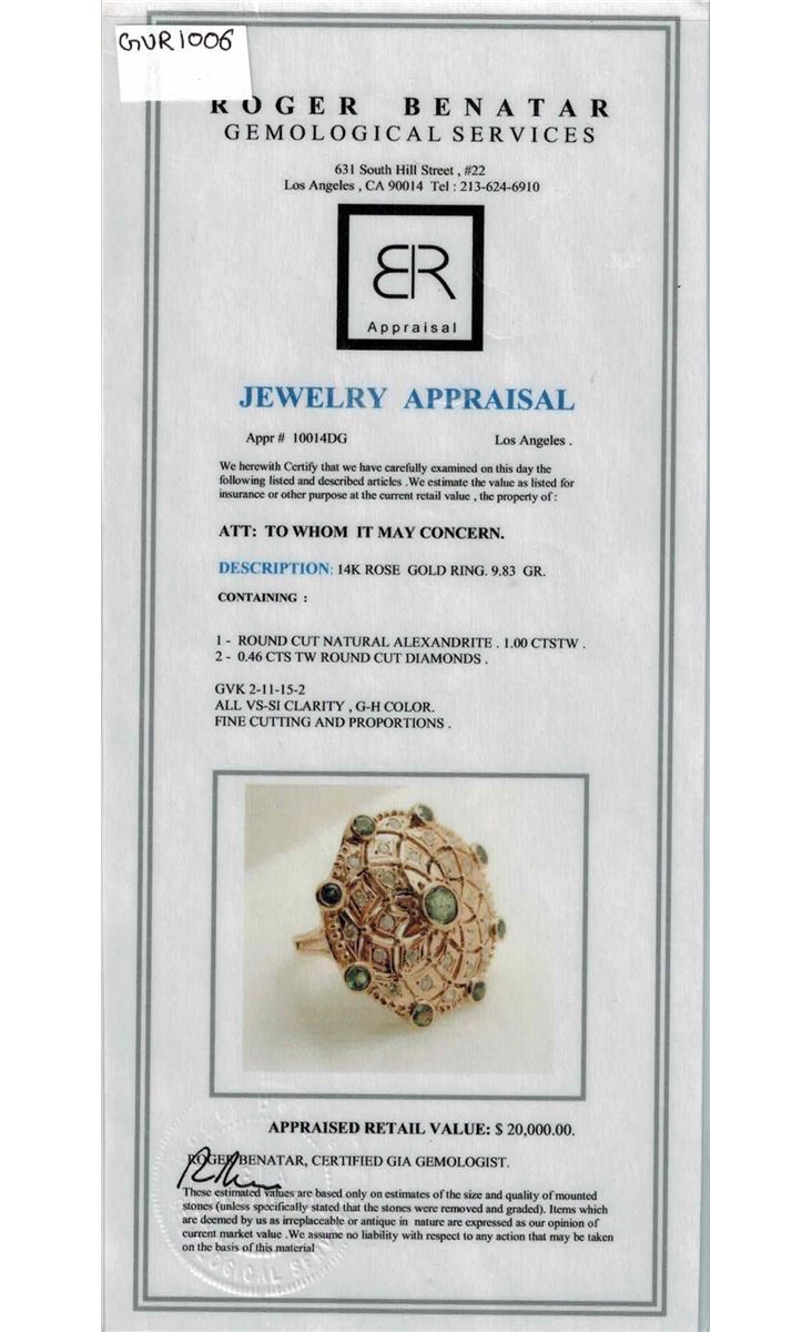 14K ROSE GOLD NATURAL ALEXANDRITE RING:9.83 GRAMS/DIAMOND:0.46CT/ALEXANDRITE:1CT/#GVR1006
