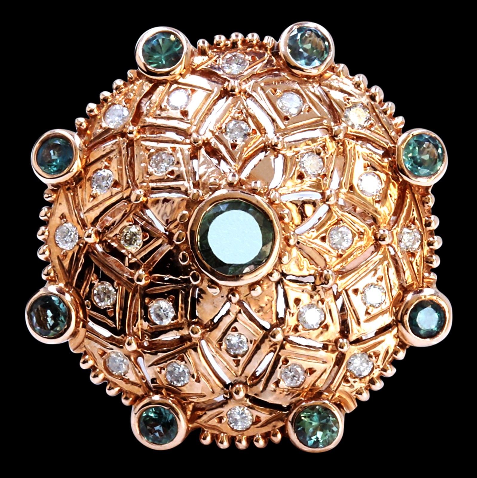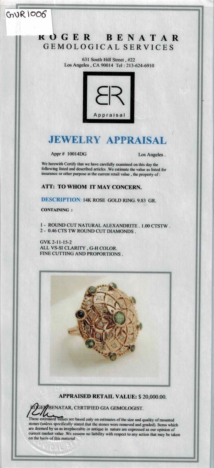 14K ROSE GOLD NATURAL ALEXANDRITE RING:9.83 GRAMS/DIAMOND:0.46CT/ALEXANDRITE:1CT/#GVR1006 **Crafted in warm 14k rose gold, this elegant display of sparkling 1.00ct round cut misty green natural Alexandrite are stones of good fortune. Generously adorned with shimmering 0.46ct round cut diamonds, this ring is a glittering bouquet of timeless beauty. **