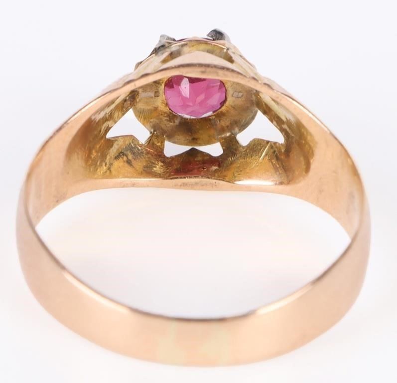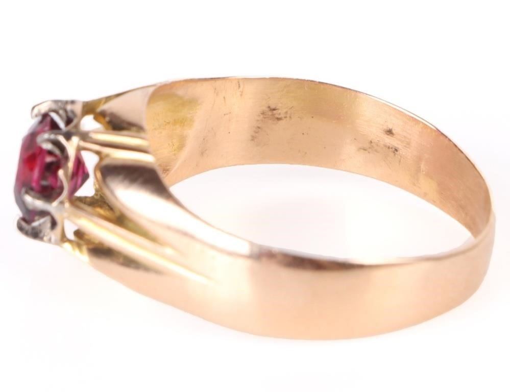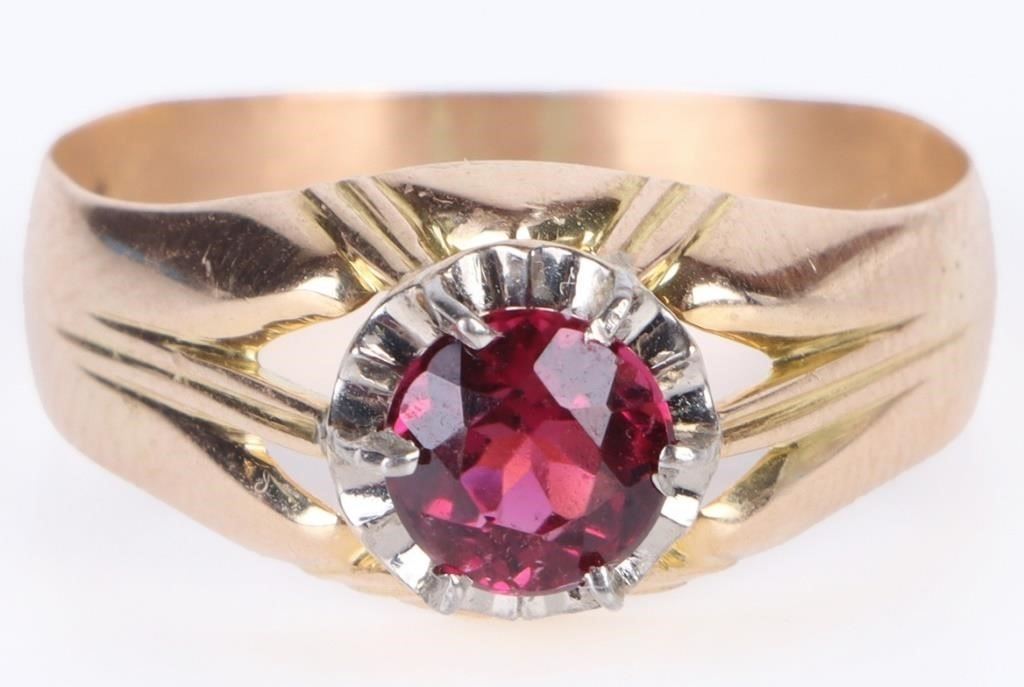 14kt yellow ladies ring with 1ct round cut garnet gemstone.