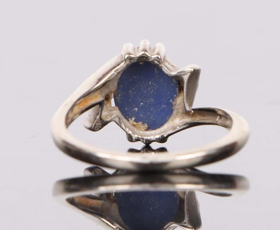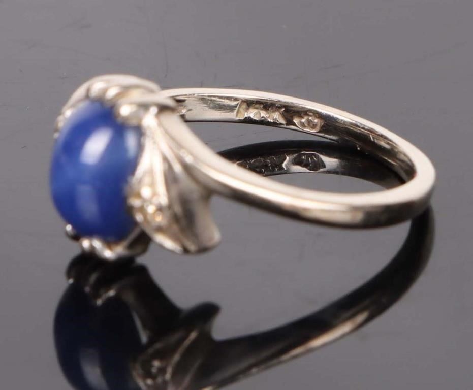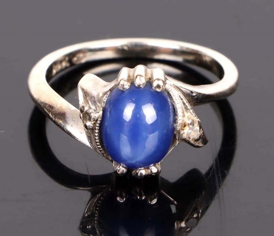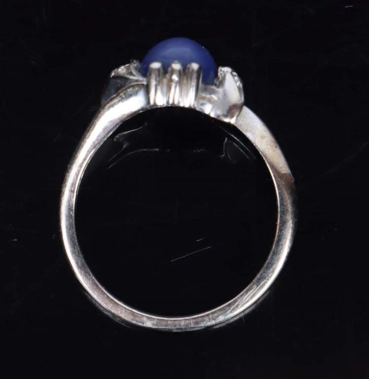 14k white gold ladies ring with a 1ct cabochon star sapphire gemstone. Two melee diamonds the ring with one stone on each side of the sapphire