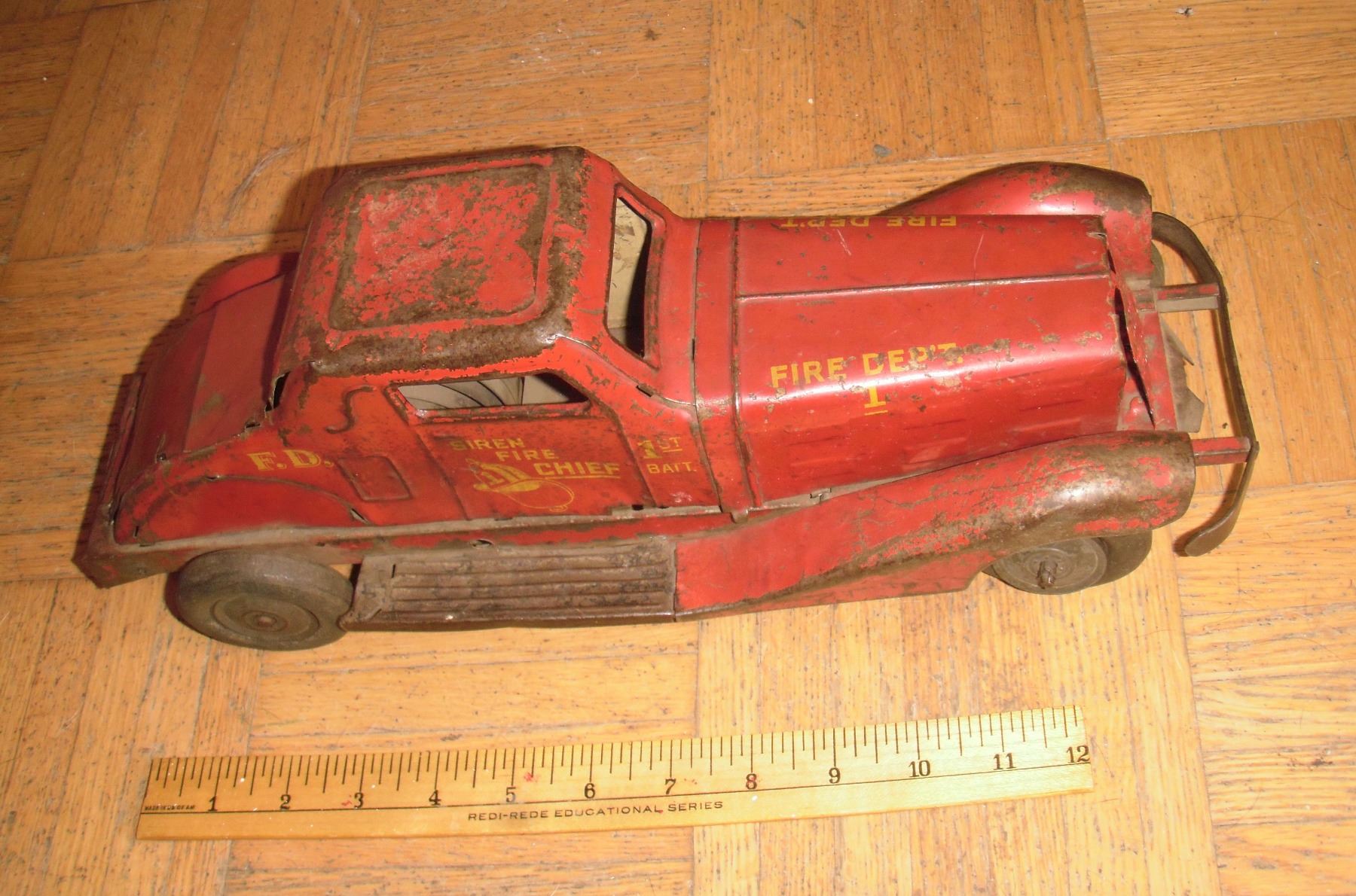 Antique "Fire Chef Dept 1" as is toy truck rare, metal, hard rubber tires (as is one), original letters "Fire Dep't" on hood both sides, plus on both doors : "Siren Fire Chief" ; missing one back fender (can maybe be found or you make one) ; rare with bumper ; original red colour ; the radiator is light red since it was not shown in vitrine as showcase changed the colour of the rest of the car during over 50 years plus ; not tried with battery (not included), you must see it under too ; for collectors !!!
