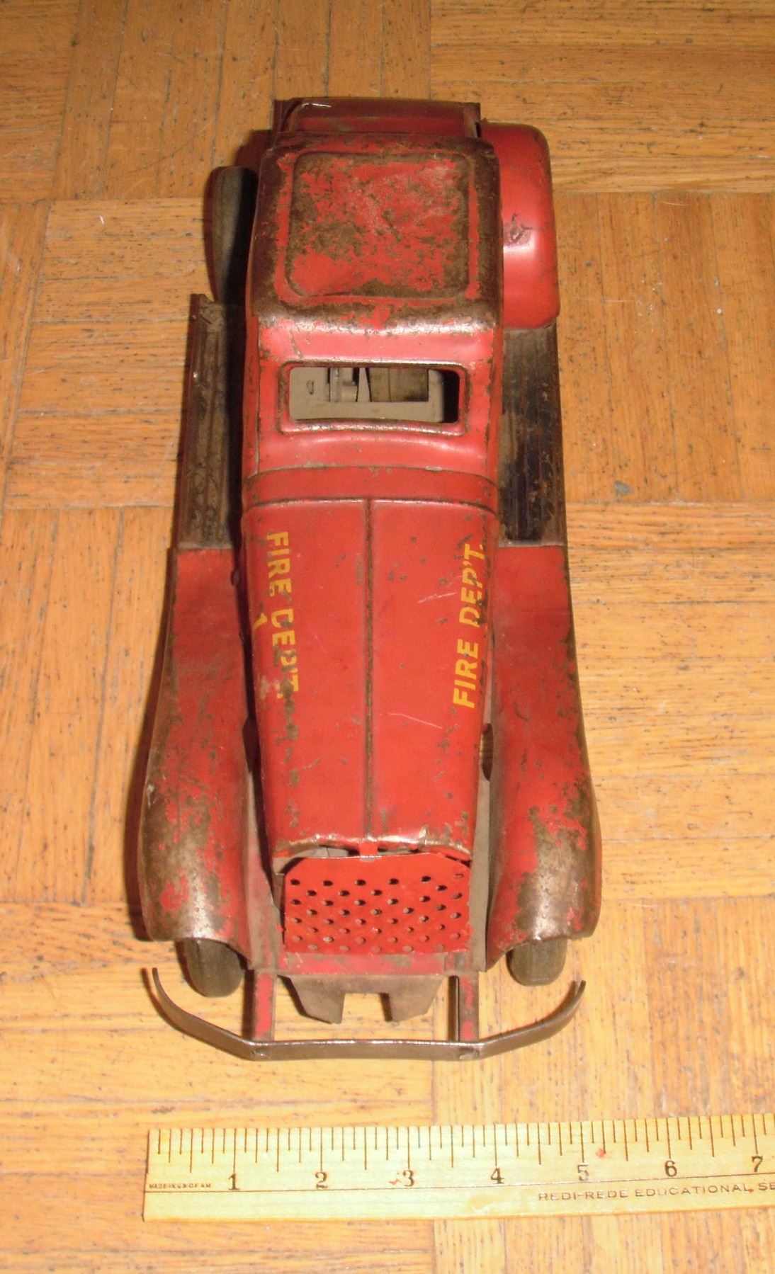 Antique "Fire Chef Dept 1" as is toy truck rare, metal, hard rubber tires (as is one), original letters "Fire Dep't" on hood both sides, plus on both doors : "Siren Fire Chief" ; missing one back fender (can maybe be found or you make one) ; rare with bumper ; original red colour ; the radiator is light red since it was not shown in vitrine as showcase changed the colour of the rest of the car during over 50 years plus ; not tried with battery (not included), you must see it under too ; for collectors !!!