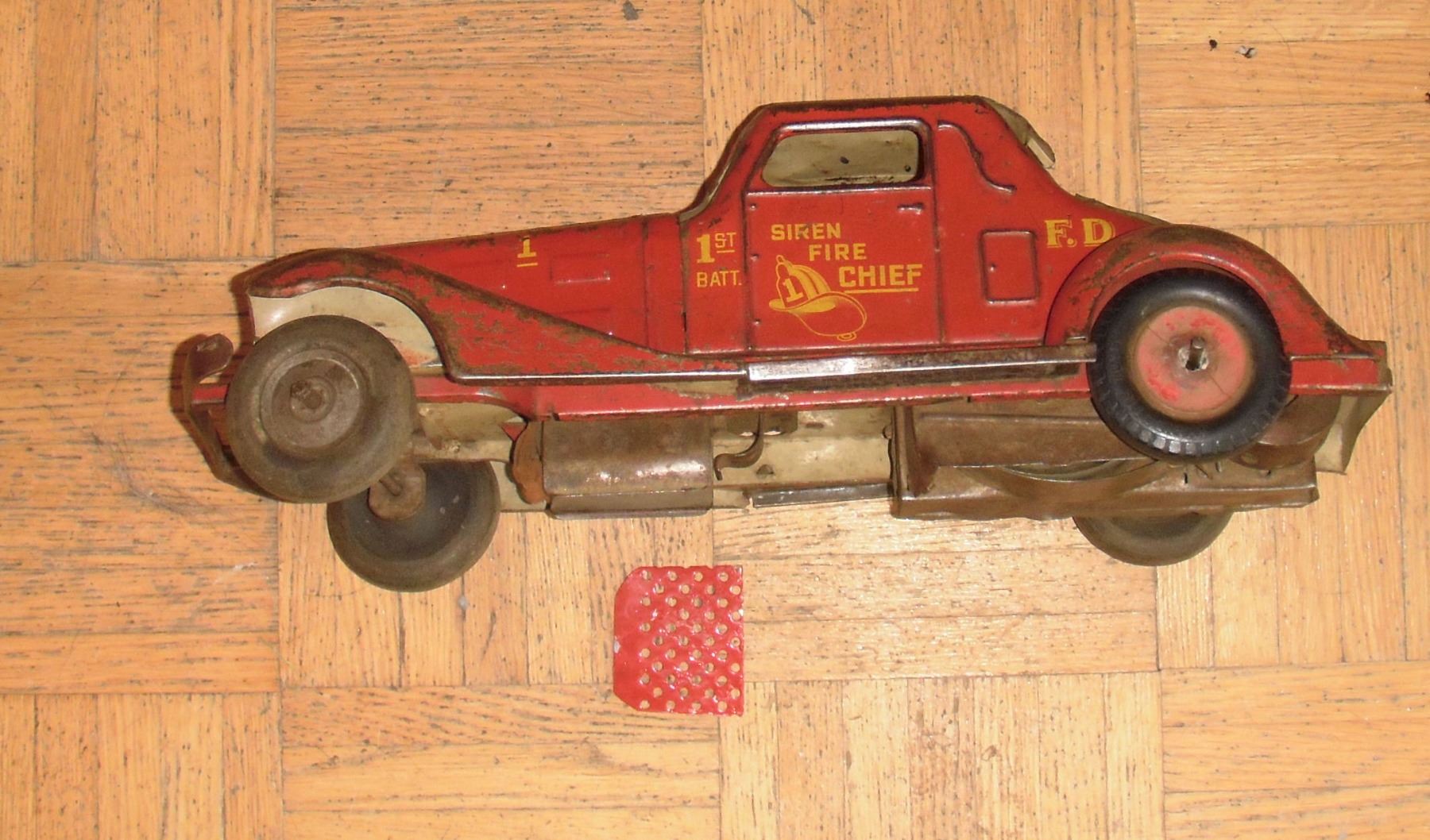 Antique "Fire Chef Dept 1" as is toy truck rare, metal, hard rubber tires (as is one), original letters "Fire Dep't" on hood both sides, plus on both doors : "Siren Fire Chief" ; missing one back fender (can maybe be found or you make one) ; rare with bumper ; original red colour ; the radiator is light red since it was not shown in vitrine as showcase changed the colour of the rest of the car during over 50 years plus ; not tried with battery (not included), you must see it under too ; for collectors !!!