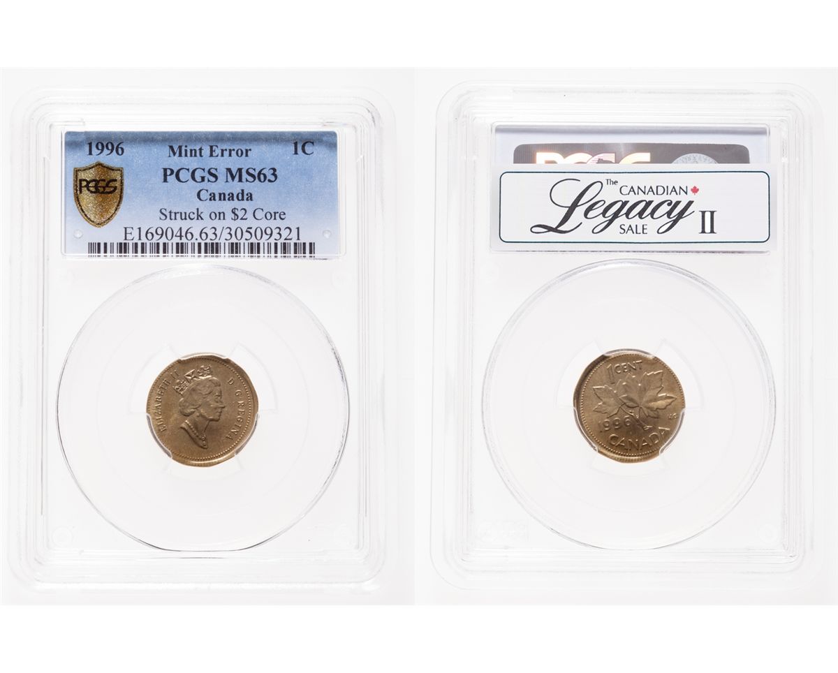 1 Cent. 1996. PCGS graded Choice Uncirculated-63. Error - Struck on $2 core. Extremely rare.