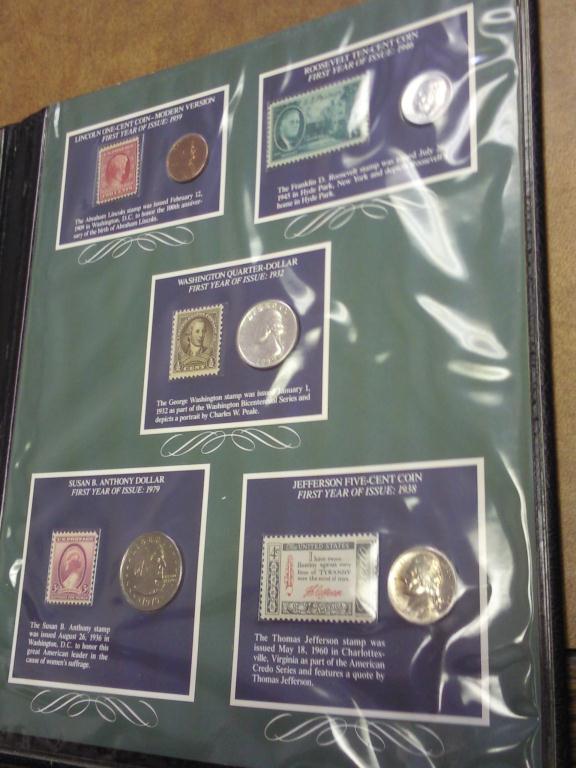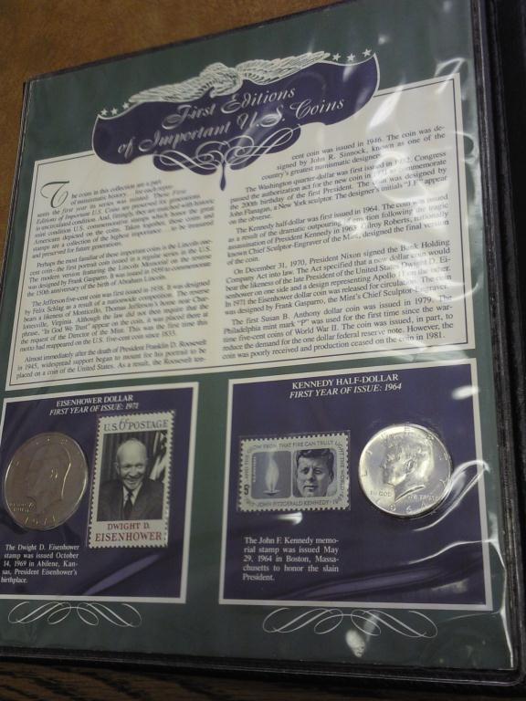 1959 LINCOLN CENT, 1938 JEFFERSON NICKEL, 1946 ROOSEVELT DIME, 1932 WASHINGTON QUARTER, 1964 KENNEDY HALF DOLLAR,1971 IKE DOLLAR, 1979 SBA DOLLAR, ALL UNC + STAMPS, (AS SHOWN)