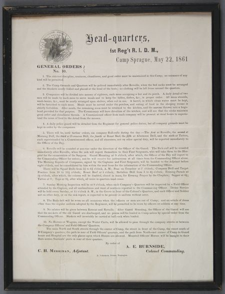 Folio broadside, titled "Camp Sprague [Staten Island, N.Y.] May 22, 1861, being General Orders No. 10 signed in print "A. E. BURNSIDE, Colonel Commanding.". The broadside lists ten basic regulations for the camp to ensure good order and sanitation, organizing messes, camp police, times for revile, inspection and other matters. Usual folds, else fine condition and housed in a simple frame.
