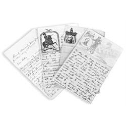 A fantastic 37 letter correspondence from Union Private Jerome Carr, mostly in period ink, totaling 116pp., 8vo., some with patriotic designs, dating from October, 1861 to July, 1864, and giving a rarely-seen, graphic look into the unique service of a cavalry soldier. Carr joined the 1st Rhode Island Cavalry in October, 1861. He actively campaigned and was hit by two spent bullets at Front Royal, had a shell explode three feet from him killing many men and horses, and, by late 1862, was captured. Once paroled, Carr rejoined his regiment but was again captured in August, 1864 and died as a prisoner of war. Though a devoted Union soldier, he never failed to lay blame on his generals whom he felt deserved criticism, and also added many dark comments on the black race as a proslavery man. In small part: "…[Concord, N. H., Oct., 1861]…I arrived safely in Concord about 1/2 past three and was marched into the State house square…ours is the only company there is here now but we expect some more this week…the stable is 500 feet long…there are now here 167 horses and a fine looking set they are…[Camp Terney, Dec. 26, 1861]…one of the first company had two fingers broken the other day by a kick [from a horse]…it was the Dave Hunt mare that kicked him…we ain't afraid of England and the Rebels....[Armory Hall, R. I. Dec. 21, 1861]…Gov. Sprague is now in Washington to see what is to be done with us…[Armory Hall, R. I., Jan. 26, 1862]…we were ordered by railroad…[to Rhode Island]…we had to pack our saddles and bridles, our blankets, pull the shoes off our horses…we started for the depot…amid the cheers of a good many spectators…one of the cars containing the horses burst open and one horse turned a somersault out into the snow…arrived at Pawtucket…shall go into camp here but expect to go to Washington this week…[Camp Arnold, Mar. 6, 1862]…we have orders to start for Washington…Gov. Sprague is going with us…[Washington, Mar. 21, 1862]...Washington with the exception of the United States buildings is a miserable looking hole the back streets are occupied by hogs, dogs, and niggers…my best friend Morrison…has gone to Manassas …with a company of the Rhode Island boys after the remains of Col. Slocum who was killed at the battle of Bulls Run...the Maine cavalry are in camp on the same plain with us and one company of regulars. We are right under Fort Lafayette a fortification made by Sickles…[Warrenton, Va., Apr. 15, 1862]…I wish you could see the ruins the rebels have left. They have burned houses, felled forest, and destroyed railroads…we had one horse shot and took one prisoner…[Warrenton, May 2, 1862]…we jammed through the mud until our poor jaded horses cared not for the spur and put up our first night in Fairfax threw my rubber tent on the ground…at Centreville are great numbers of dead horses I counted 26 in one pile…we crossed the old battle ground of Bull's Run and could see where the balls went crashing along there was a house near by and three went through…[Warrenton, May, 12, 1862]…[McClellan] is fast putting this rebellion down…soon this unnatural war will be at an end. Yorktown is ours and without a fight…our battalion went out scouting we rode over a good deal of ground and went to the Rappahannock river but alas the rebels have all left…I stood picket guard Thursday night and what we all supposed to be a company of rebel cavalry went galloping by on my right but I and five more could not handle them so I did not raise any alarm and they did not notice me…our battalion has done a good deal of running and picketing since we came into Virginia…[we] are now in McDowell's reserve…we had a [thunder] storm here…it blowed over wagons and carried them some ten rods…our horses broke loose and ran some through tents…a good friend of mine had his knee broke open by a horse hitting him in his fright...[May 29, 1862]…I have been moved again and am now in Gen. Shield's division…Bank's got in trouble and we were ordered back…we now have marched a forced march of four days…and are now here in the mountains close by the enemy…[Front Royal, Va., May31, 1862]…you will have learned that the N. H. Battalion charged on a rebel force and came off victorious…The number we killed of the enemy I don't know but we took 115 prisoners and lost 8 killed including one captain and 6 wounded. One of my best friends was killed but I am all right two bullets hit me one on my thumb and the other on my shoulder but neither hurt me…I am glad I am here the balls flew like hail stones and the men fell, the horses lay dying…[Rappahannock, Aug. 4, 62]…We are stationed at this place to guard the bridge and railroad…the rebels will try to get round in here and burn the bridge…Byron is acting as Col's orderly…[Ft. Albany Washington, Sept. 7, 62]…I am now in the midst of great moving armies. They march by day and counter march by night…our horses have stood under the saddles 80 hours…I have been in battle four different times within two weeks…Geo. Morrison had a horse killed under him by a shell…I was within three feet of him when it happened. Three horses were killed by the same shell but not a man was hurt…these shells and large cannon balls make the dirt fly…the rebels have another kind of missile which they throw made by railroad track cut put into chunks about 1 1/2 feet long…they will shoot railroad sleepers at us…I was detailed to take care of Maj. Swett's horses and one of them being a nice stallion…we have been licked by old Stonewall…the reason we have a traitor in a high place and if he sees a chance he will yet ruin this country. McDowell is the man he is hurting the cause worse than Jackson…[Poolesville Md., Sept. 18, 62]…our regiment is down the Potomac on picket some six miles from here…[Conrad's Ferry Md., Oct. 2, 62]…Major Swett with two companies of his battalion were ordered do