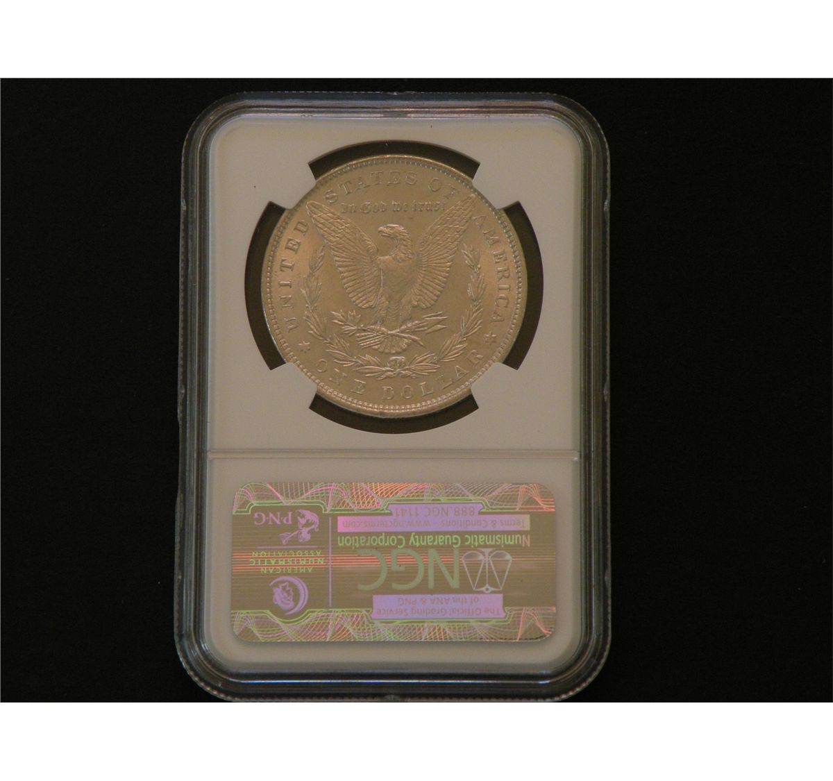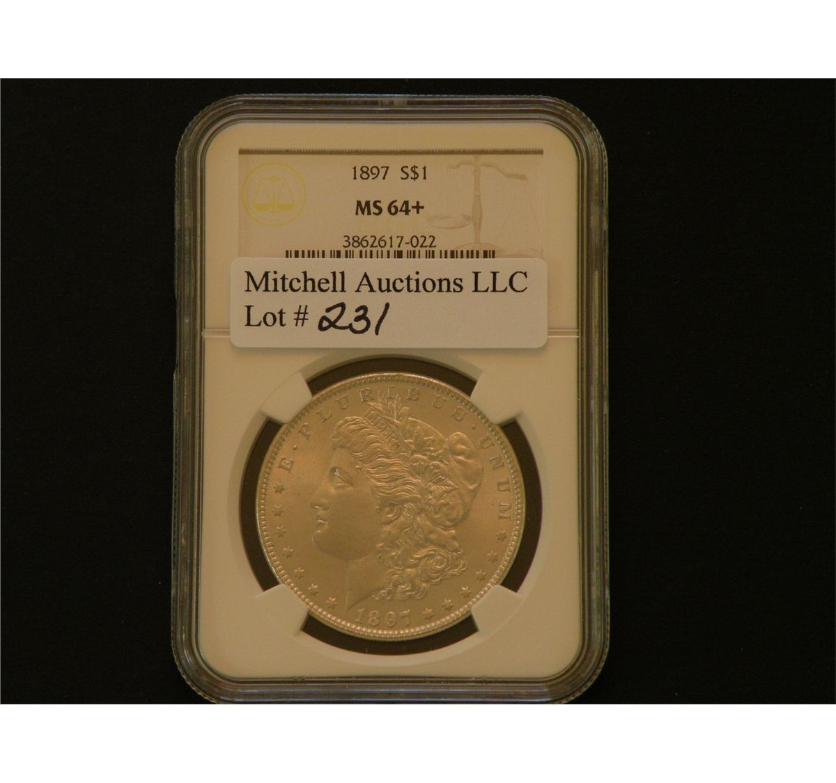 $1 Silver. 1897 NGC MS64+ and quite compelling for the grade. The surfaces are quite smooth and arguably worthy of full Gem status. Est$100.