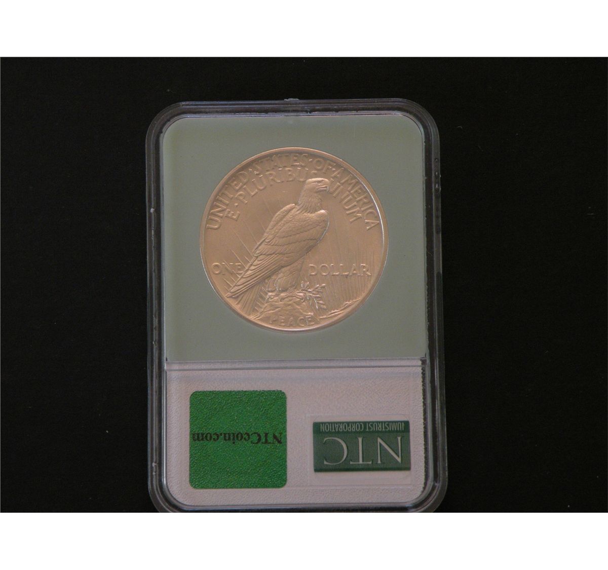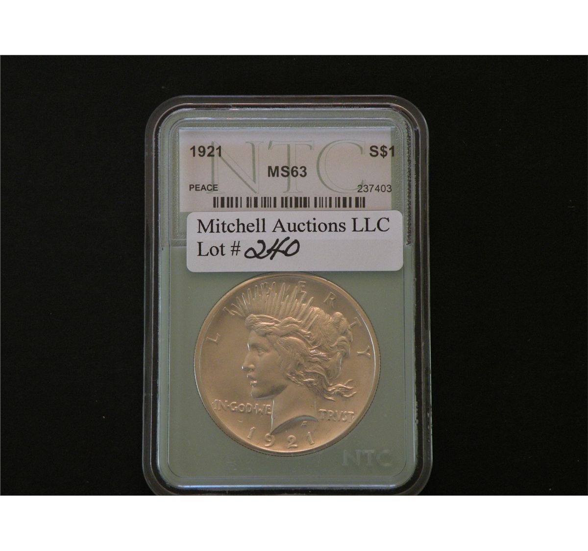 $1 Silver. 1921 Peace. NTC MS63. Bright and frosty. Our grade is AU58 or better with evidence of subtle cleaning. Est$200