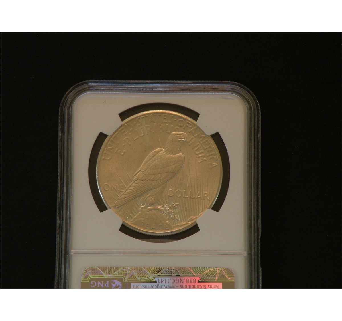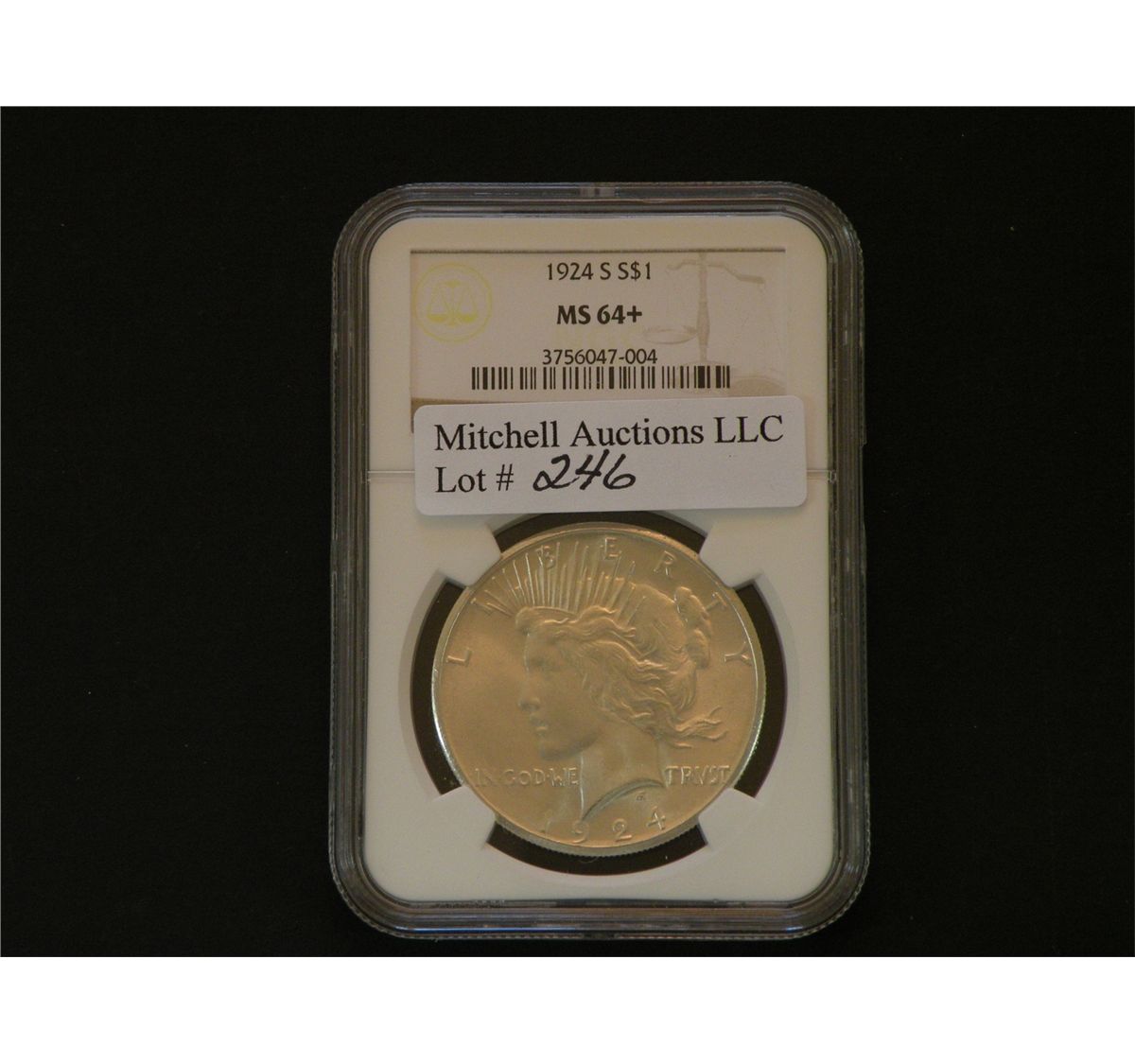 $1 Silver. 1924-S NGC MS64+. Here is a lovely virtual Gem that will fit quite nicely into any high quality Peace Dollar collection. Extremely scarce and wholly worthy of consideration in light of the $7000- $10,000 price tag normally assigned to full Gems! Est$1500