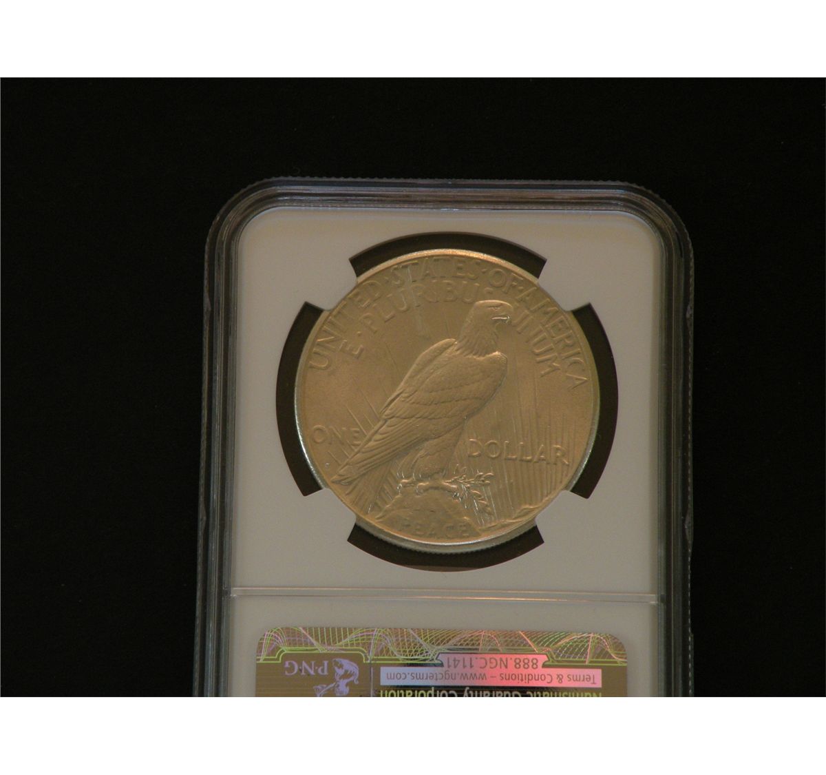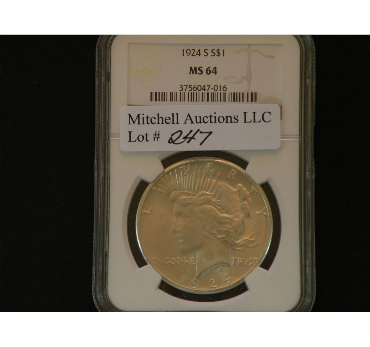 $1 Silver. 1924-S NGC MS64 and solid for the assigned numerical grade. Delicate golden surfaces enjoy unbroken velvet bloom. A particularly diffucult issue to acquire in this lofty grade. Est$1150