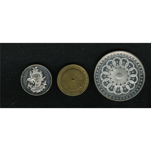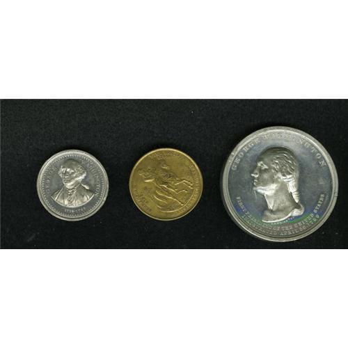 <B>Group Lot of Three Washington Medals.</B></I> Consists of: <B>(ca. 1858) George Washington Perpetual Calendar, Washington on Horseback,</B></I> by Jacobus, Baker-387, R.5, Choice AU, luster, rare so nice; <B>Washington Bookplate Medal,</B></I> Baker-287B, R.6, 33 mm, white metal, plain edge, the obverse shows a civilian bust of George Washington facing left, the reverse is Washington's Ornate Bookplate with Facsimile Signature Beneath, bright and flashy with strong mint luster, attractive natural color; and an <B>1889 Washington Thirteen Links Medal,</B></I> Uncirculated prooflike, Douglas-52A, white metal, 54 mm, a high relief bust of Washington faces left on the obverse, the reverse design features a sun encircled by a chain with 13 links, reminiscent of the Fugio cent.