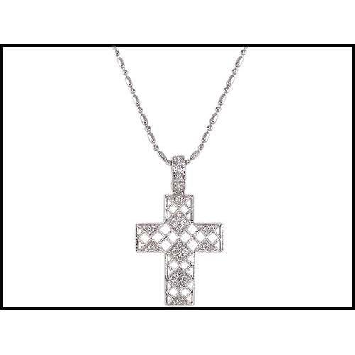This 14K white gold diamond cross pendant has it all. Great design, world class workmanship, and 22 sparkling diamonds. The price is so low that it is almost impossible to top as a fine jewelry bargain. It measures 18mm (11/16") wide x 23mm (7/8") high without the bale, and with the bale it is 30mm (1 3/16") long. No chain.
