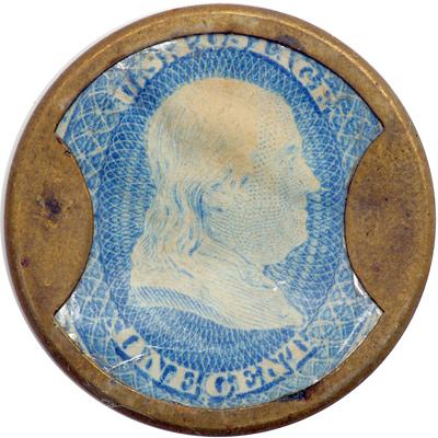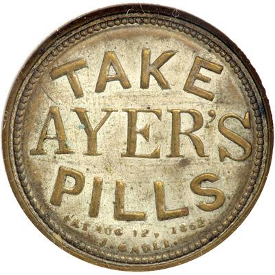 1¢ Encased Postage. Ayer's "Take Ayer's Pills". . Fr-EP-3. The untampered case grades Extremely Fine with traces of original silvering on the reverse. The 1¢ Franklin is bright blue and the mica has a few minor hairlines and some minor crazing. Overall, quite choice.