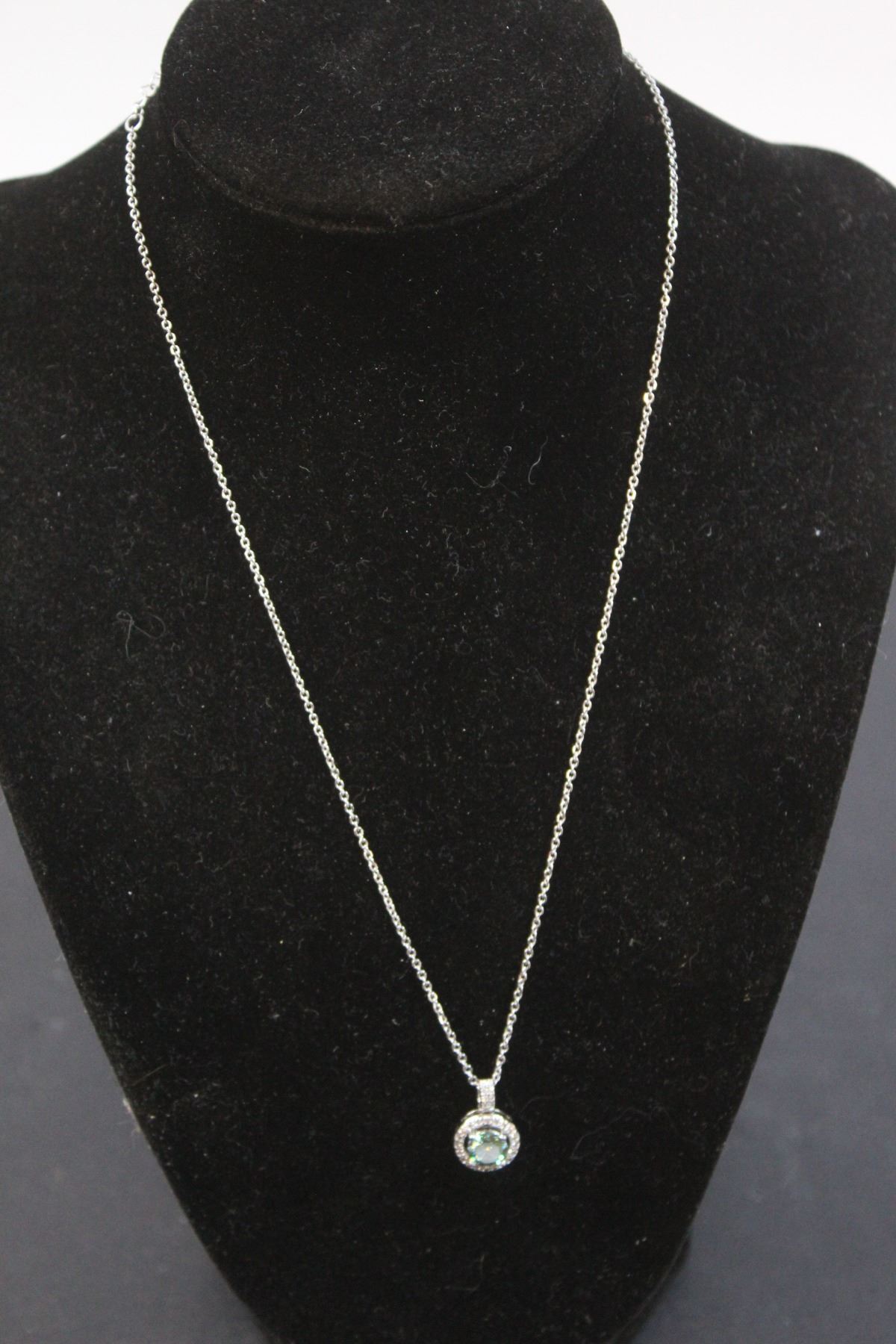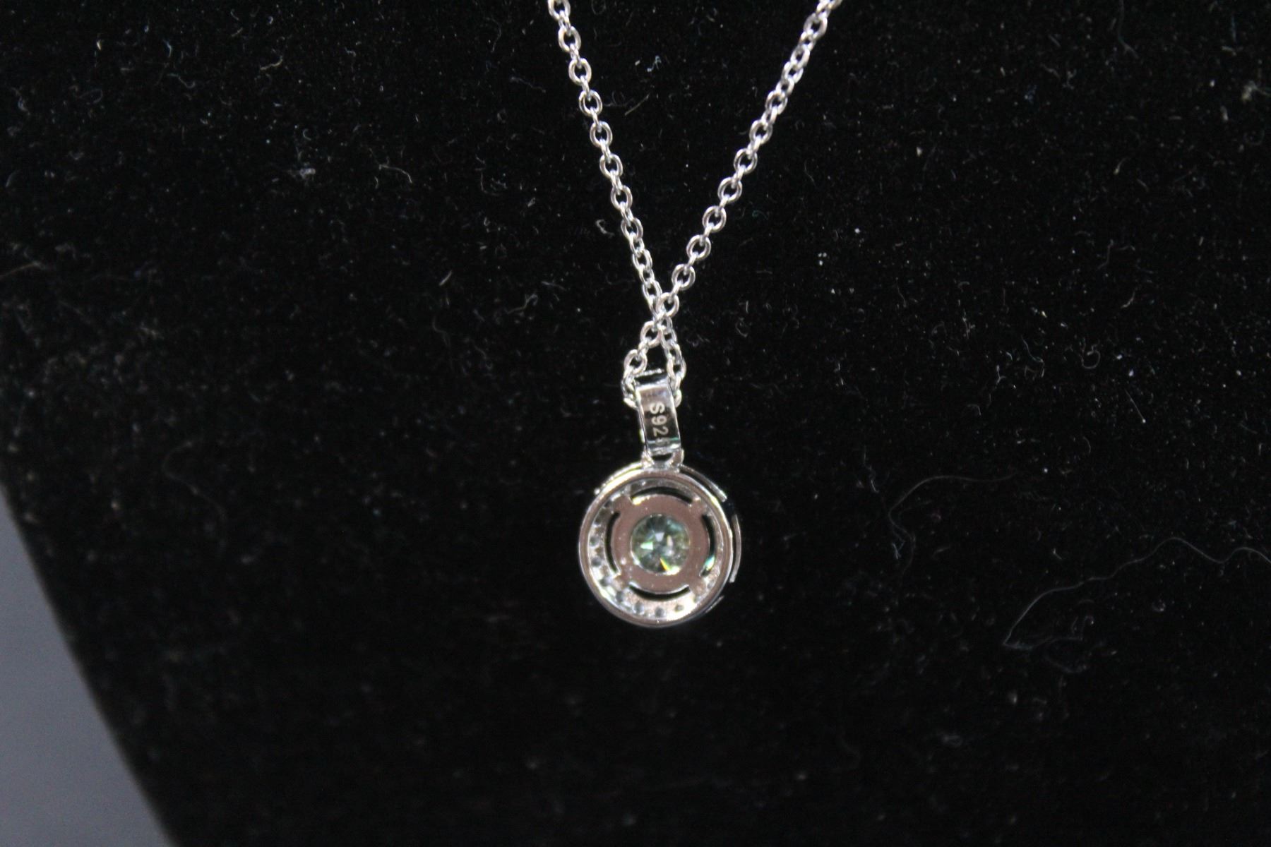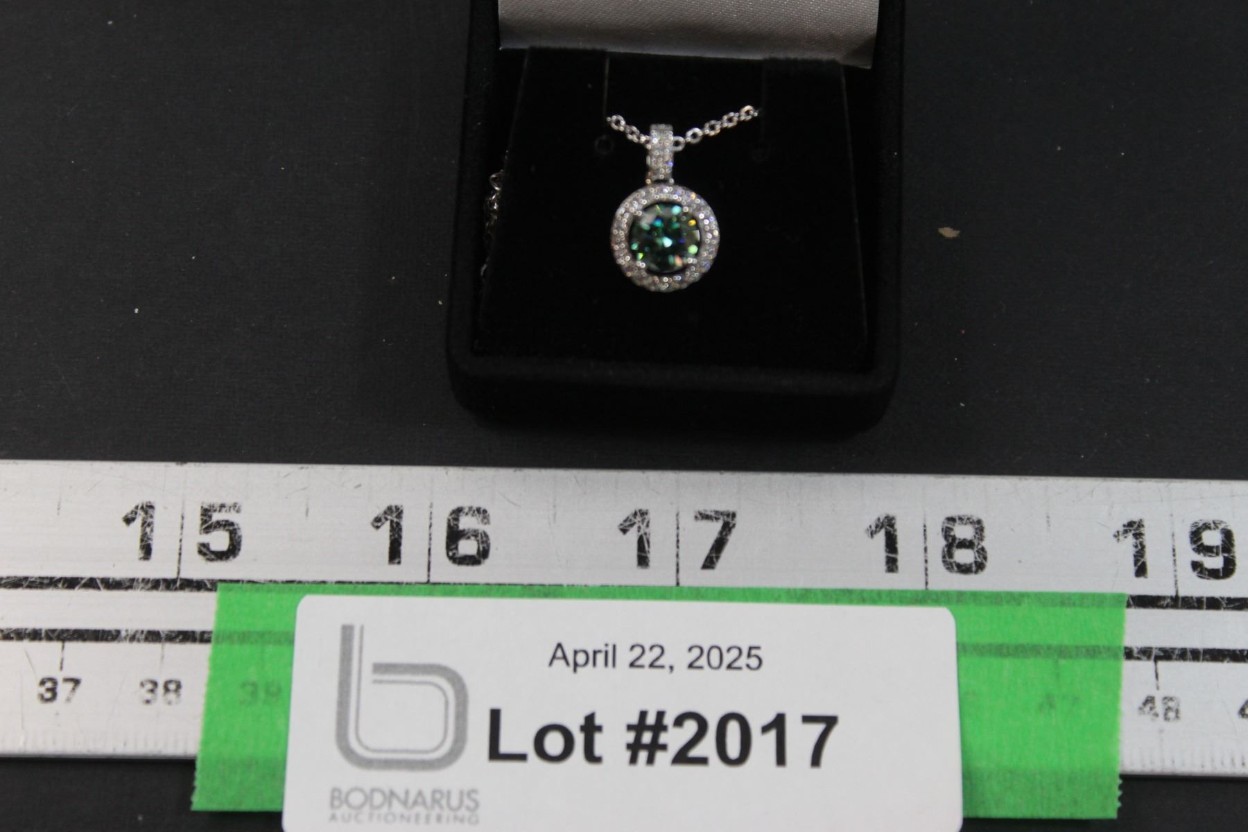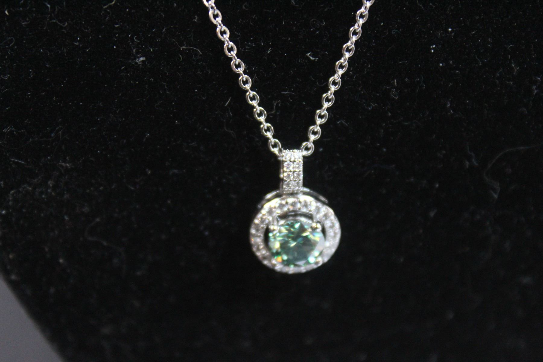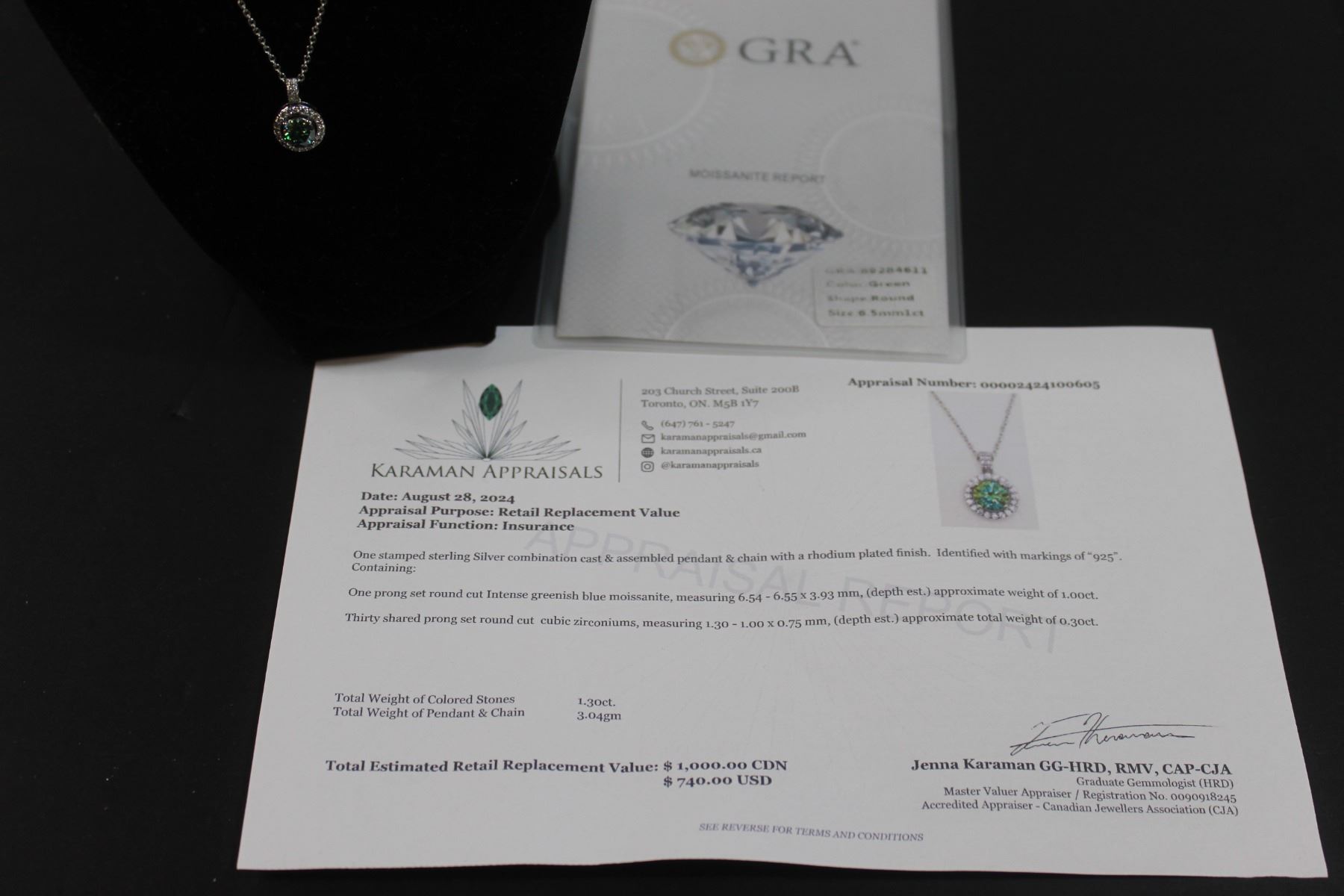^ 1ct. GRA Certified Round Brilliant Cut Moissanite Stone VVS Intense Greenish Blue Color Set in Centre of Round Halo w/(30) Round Brilliant Cubic Zirconia Set in Sterling Silver Pendant
