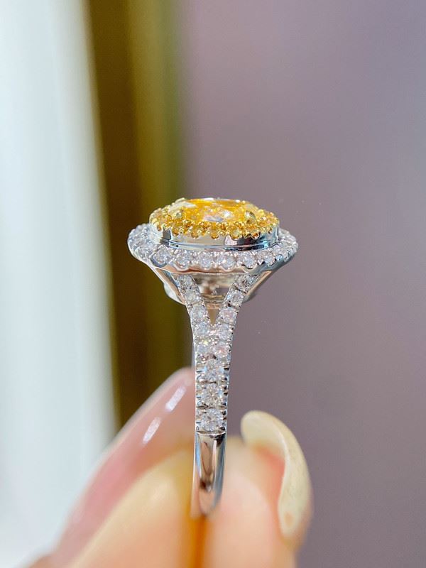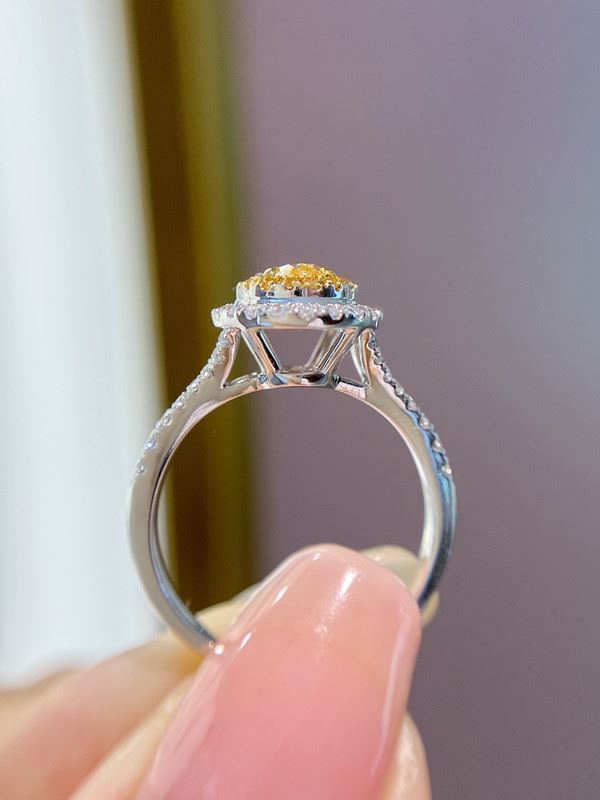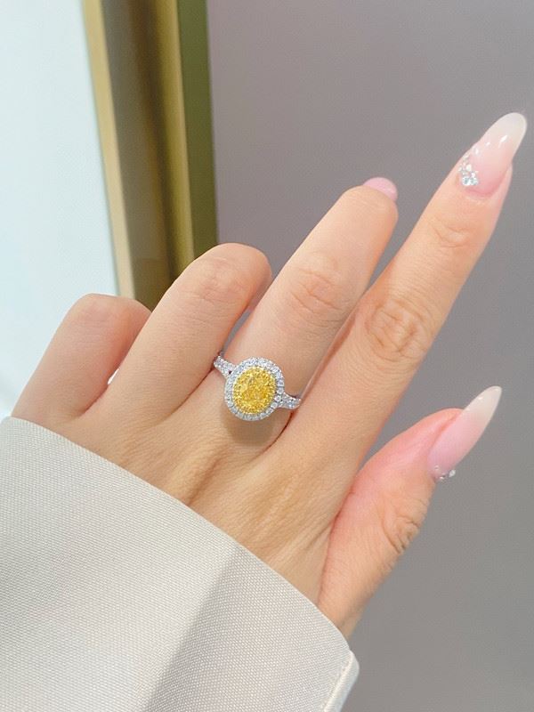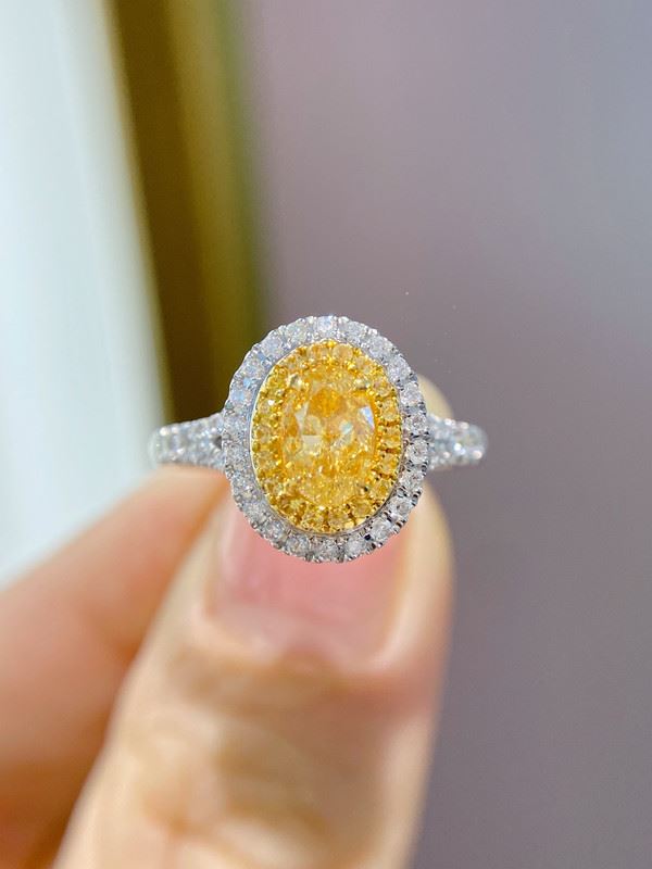 A dazzling 1ct oval yellow diamond is framed by a halo of white diamonds, set on a sleek Y-shank band that traces a graceful, modern silhouette and radiates soft yet confident brilliance on the finger.Ring size: 6, circumference: 52 mm, diameter: 16.6 mm, main diamond: 1.006ct, side diamond: 0.474ct. Note: Comes with an AGL certificate and a domestic jewelry identification certificate.