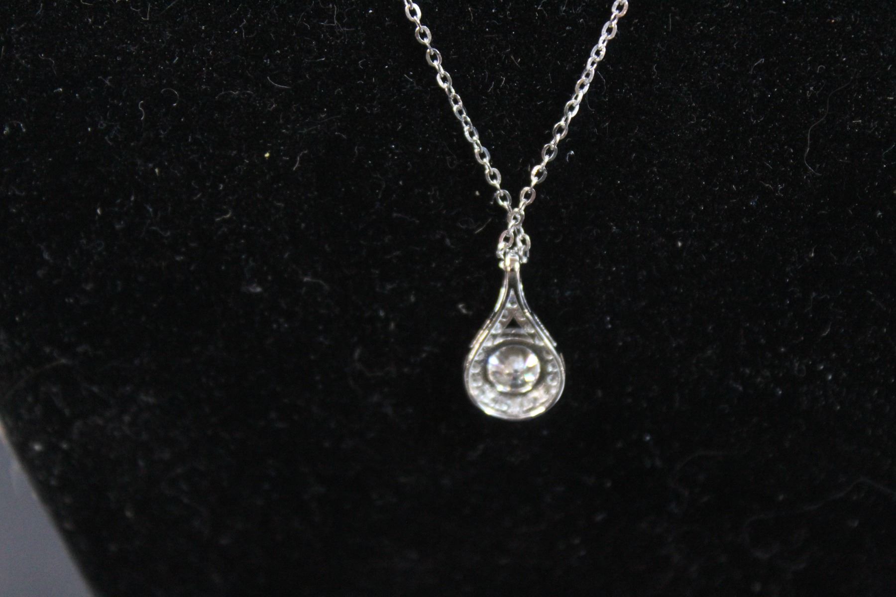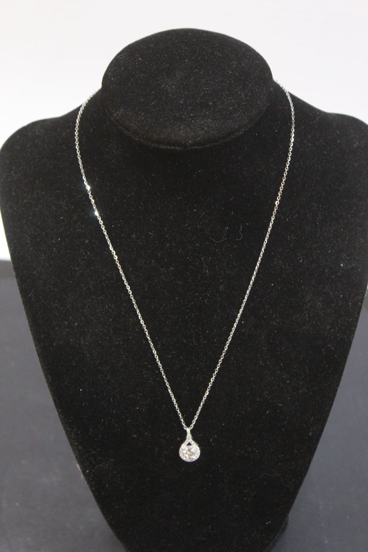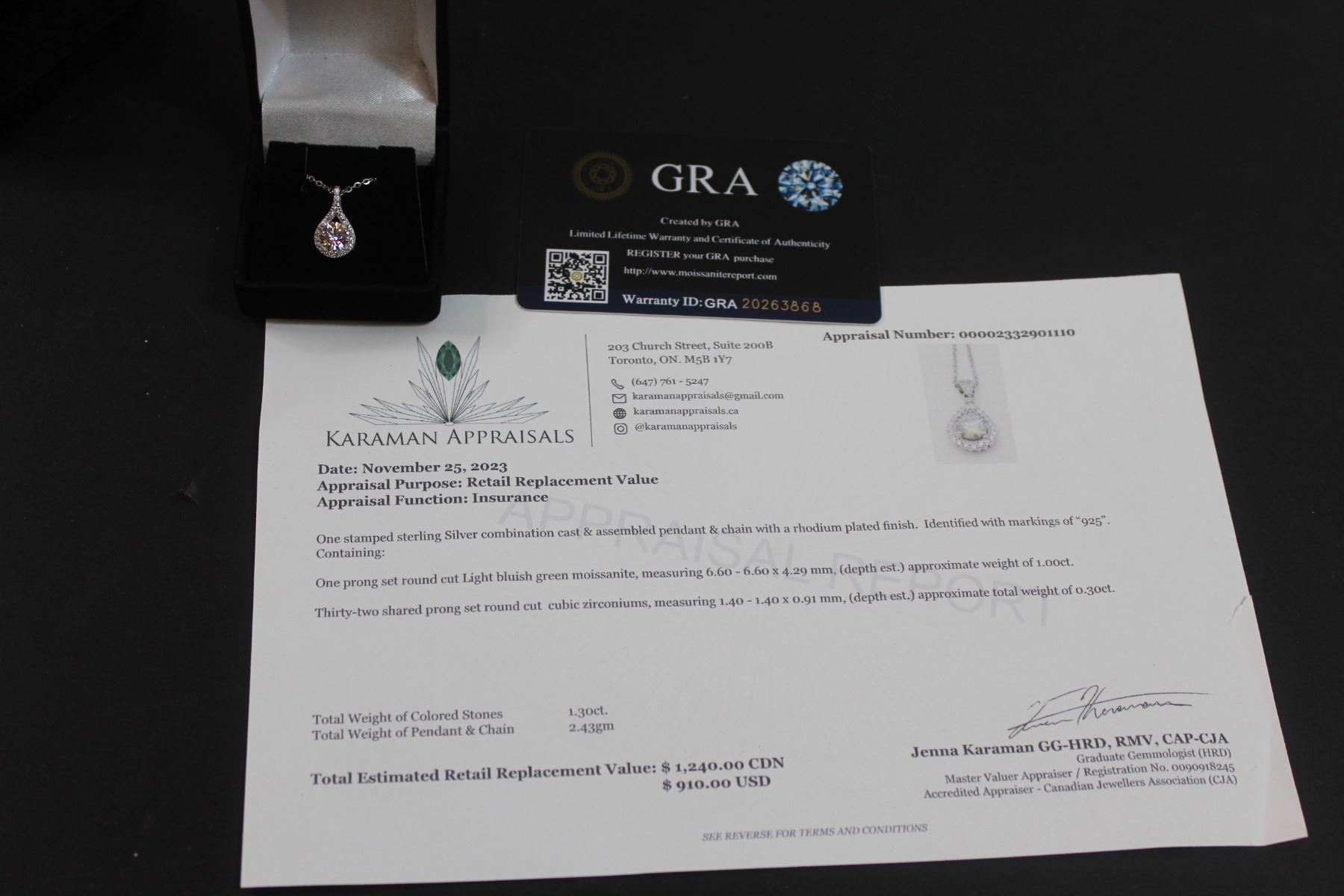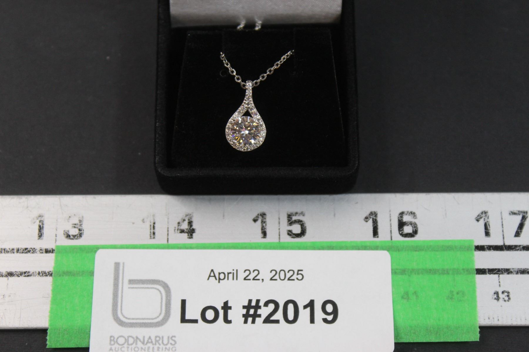 ^ 1ct. Round Brilliant Cut Moissanite Stone VVS D Color w(32) Round Brilliant Cut Cubic Zirconia Set in Tear Drop Halo Set in Sterling Silver Pendant