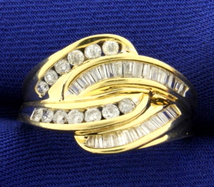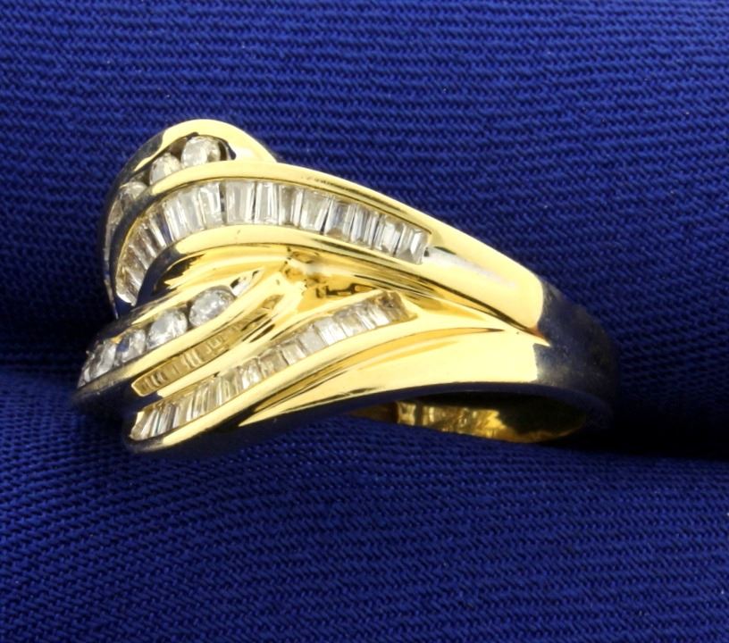 In 14K Yellow Gold. Contains thirteen high quality round Diamonds and thirty high quality baguette Diamonds, all SI clarity/H color. Size 8 1/2. 5.8g