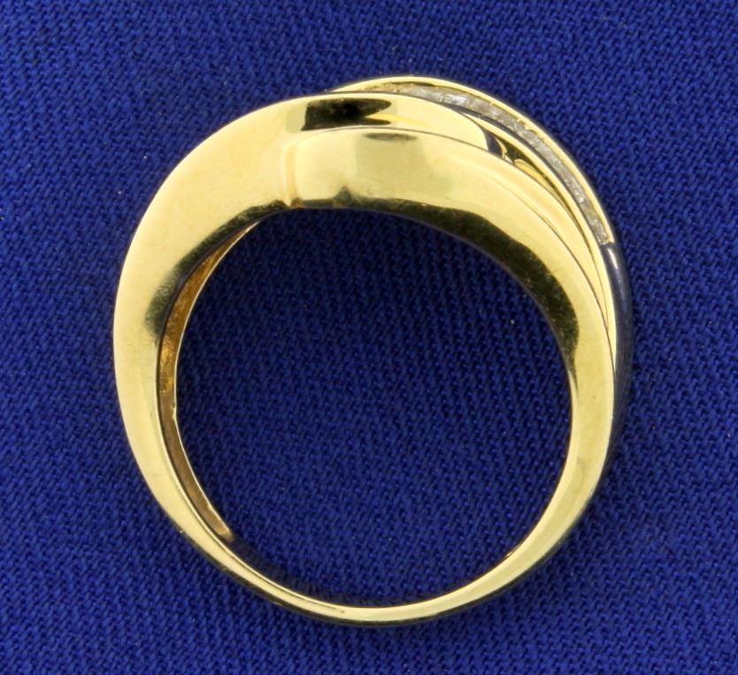 In 14K Yellow Gold. Contains thirteen high quality round Diamonds and thirty high quality baguette Diamonds, all SI clarity/H color. Size 8 1/2. 5.8g