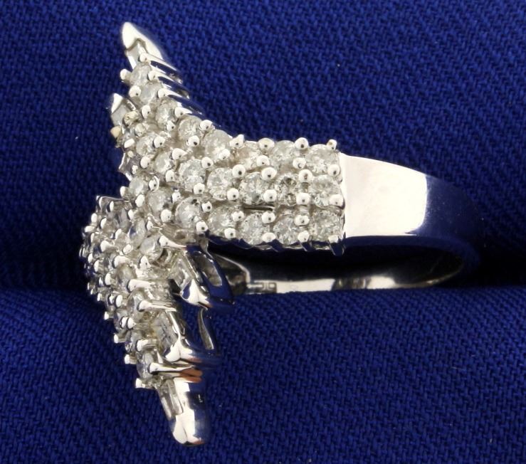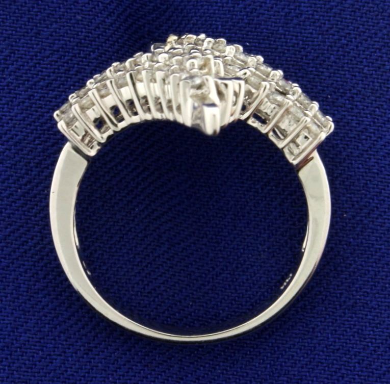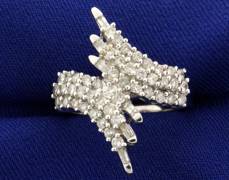In 14k white gold, containing 1ct TW of high quality round and baguette diamonds of SI clarity/H color. Size 7. 5.5g.