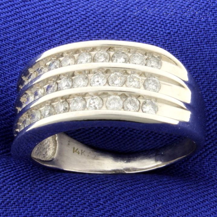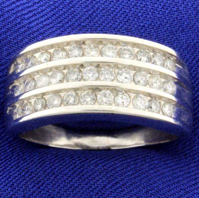 In 14K white gold, it is 10.3mm wide and contains 33 high quality .03ct round diamonds - SI clarity/H color. Size 9 1/2 6.8g