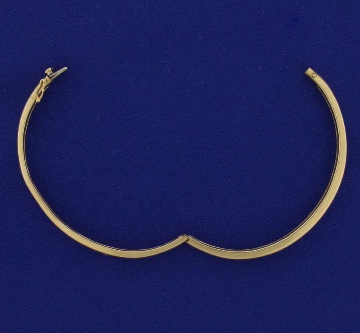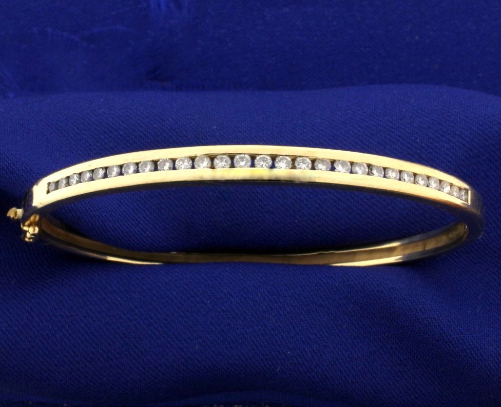 In 14k yellow gold, containing 1ct of high quality round brilliant diamonds of SI clarity/H color. Bracelet hinges open for easy putting on/taking off. 2 3/8 inch inside diameter. With safety clasp. 12.9g.