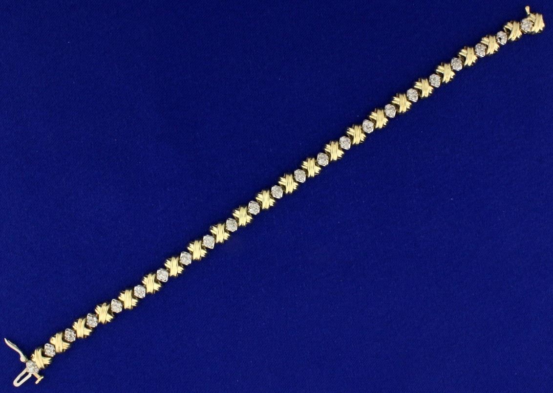 In 14k yellow and white gold. Has a unique modern design and is 7 3/4 inches long with safety clasp. 15.0g.