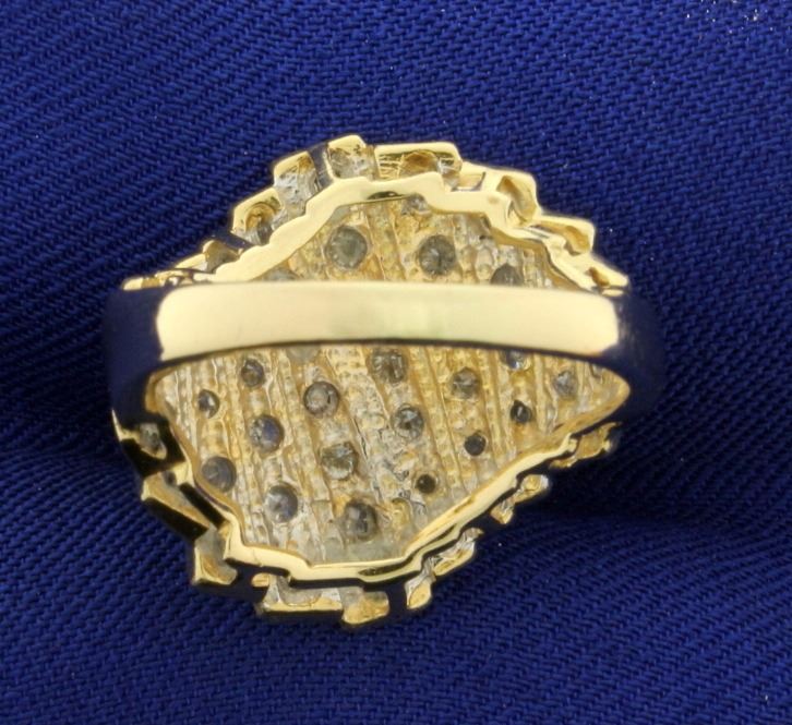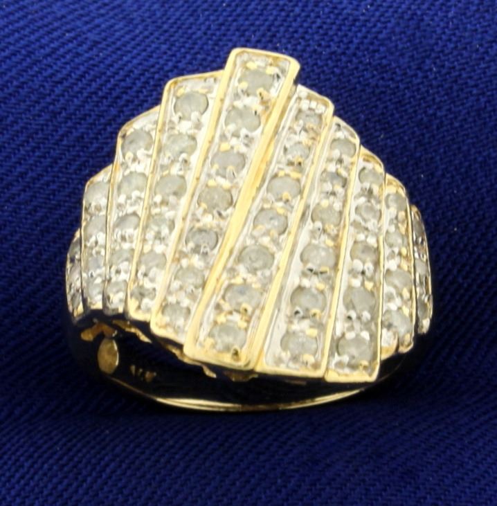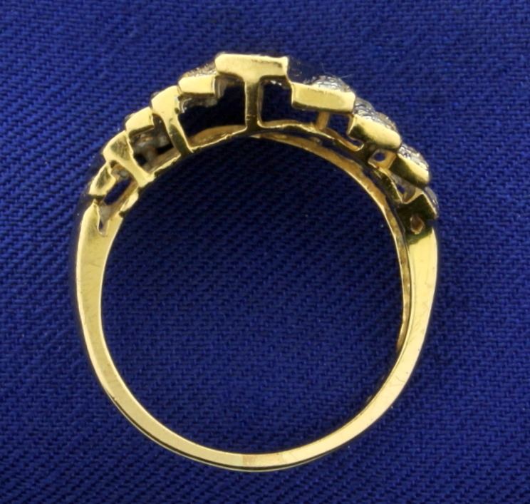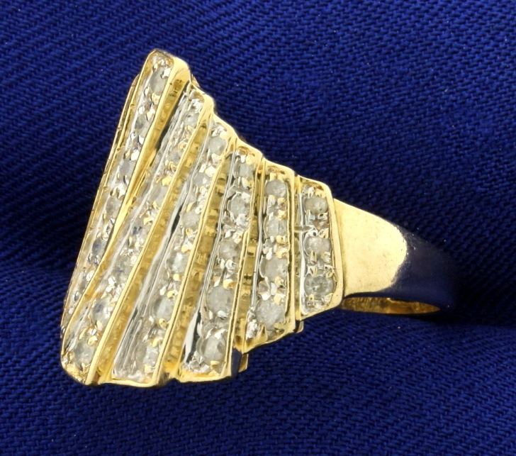 In 14k yellow and white gold. Contains fifty two high quality diamonds ranging from .01 to .03ct each, H color/I clarity. Size 7 1/2. 5.9g.