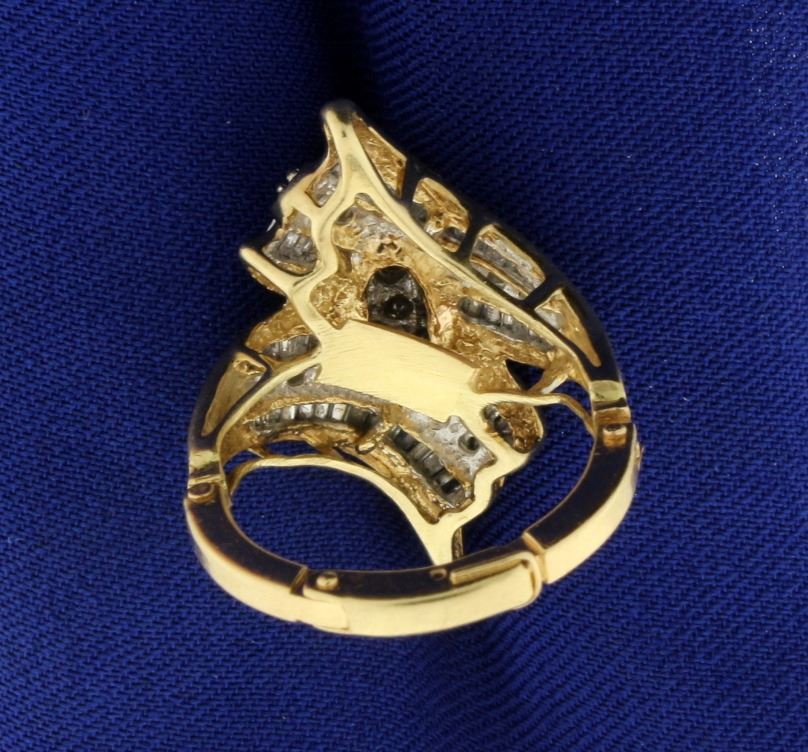 In 14k yellow gold. Contains 1ct TW of Round and Baguette high quality diamonds ranging from .01 to .04 cts each, SI clarity/G color. Size 7 with adjustable shank for easy taking on and off. 6.3g.