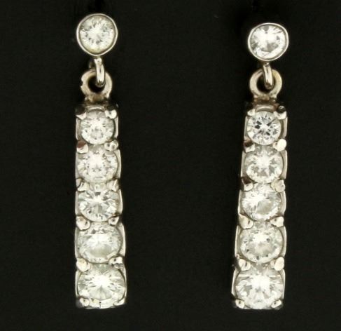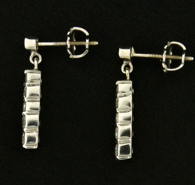 In 14k white gold, containing twelve very high quality diamonds totaling 1ct- SI1 to VS2 clarity/H color. Excellent cut, lots of sparkle and brilliance. 7/8" long with screw backs for safety. 3.2g.